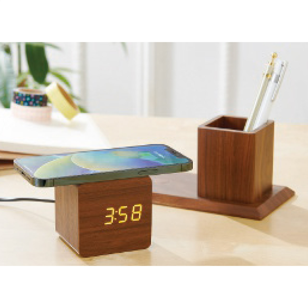環境に優しいMDFを使用。Qi対応のスマートフォンを置くだけで充電できるワイヤレス充電機能付クロック。クロック部分はマグネットで固定されており、向きの調整や取り外して使用する事も可能です。機能:ワイヤレス充電(最大10W)、時計、カレンダー、アラーム(3個)、温度計、音センサー、表示輝度調整、ペン立て