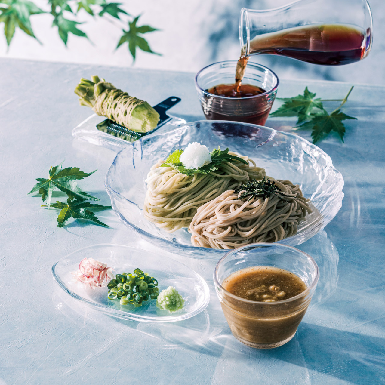 夏限定の青しそそばと、のど越しの良い信州そばの2種類のそばを堪能できます。お好みでそばとつゆの組み合わせをそれぞれ楽しめるセットです。