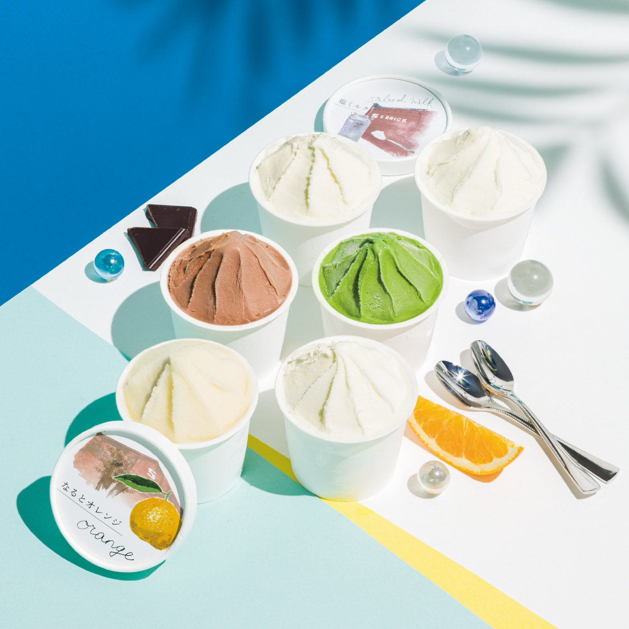 ■商品詳細 ジェラート100ml(濃厚ミルク・おのころ塩ミルク・抹茶・クリームチーズ・チョコ・なるとオレンジ各1個)・【乳成分】