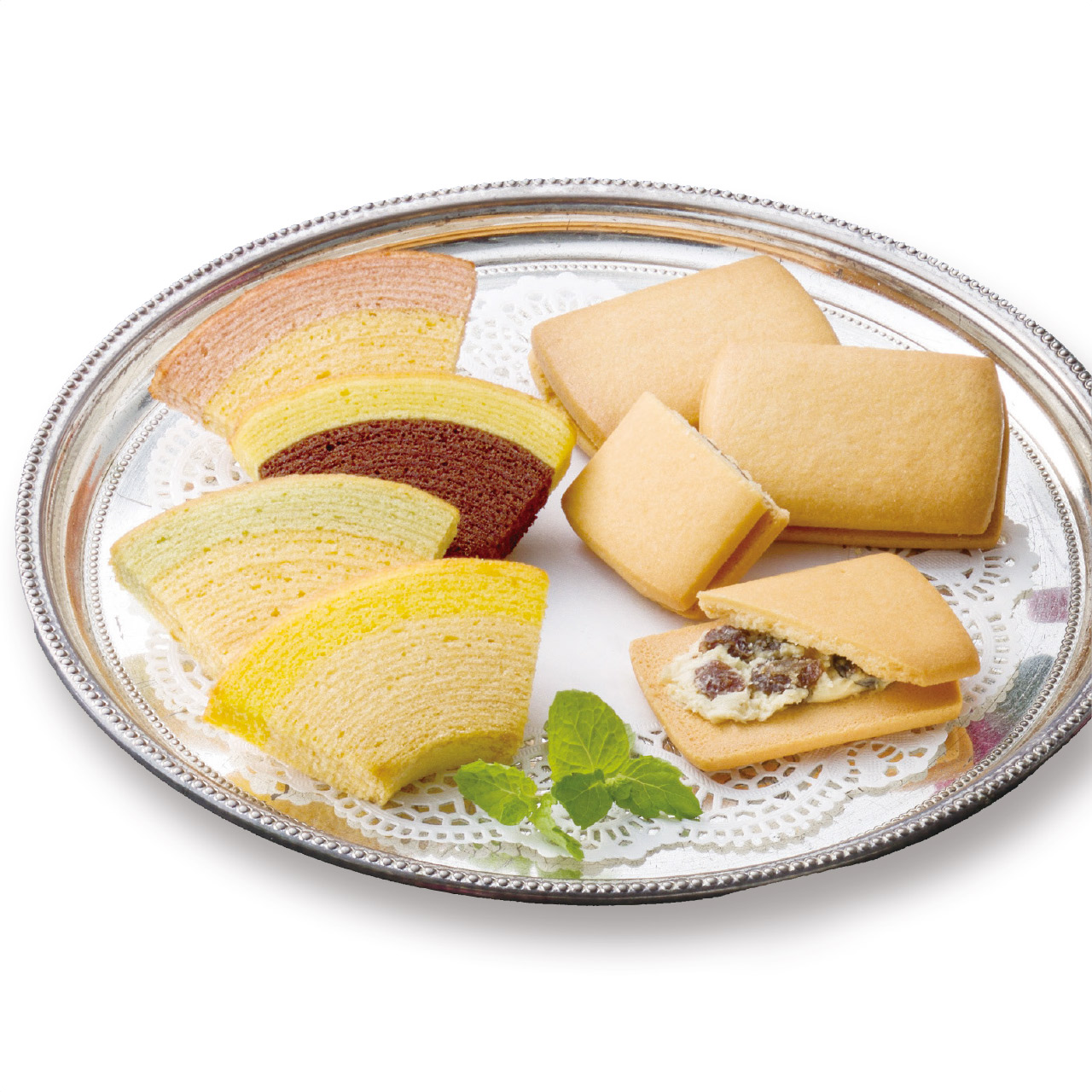 一層一層丁寧に焼き上げた生地と、果汁を加えて仕上げた生地の2つの味が絶妙なハーモニーの「フルーツクーヘン」。なめらかで口当たりのやさしいフルーツクリームと香り豊かな果肉を香ばしいクッキーでサンドした「フルーツサンド」の詰合せです。