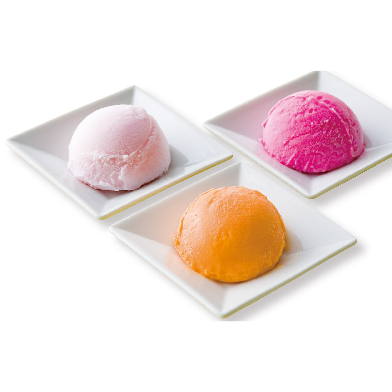 福岡県産のあまおう苺、北海道産の赤肉メロン、岡山県産の清水白桃、青森県産のりんご、長野県産の巨峰、和歌山県産のみかん、それぞれの地域で名産の果物を原料にしてつくったアイスのセットです。素材の良さを大切にした爽やかな味わいのアイスです。