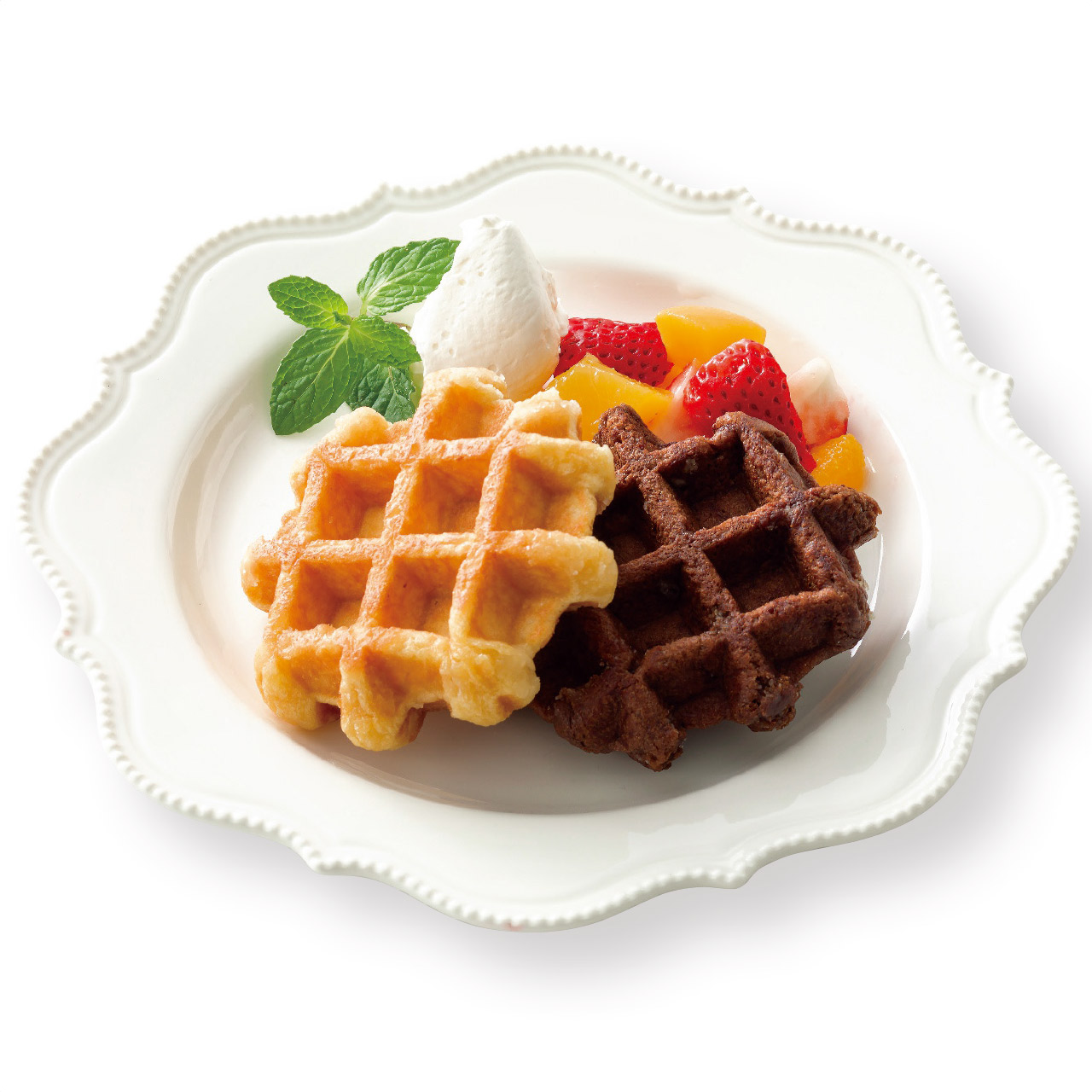 ベルギー産発酵バターとパールシュガー入りプレーンワッフルと、ベルギーチョコレートを練り込んだココアワッフルを詰め合わせました。