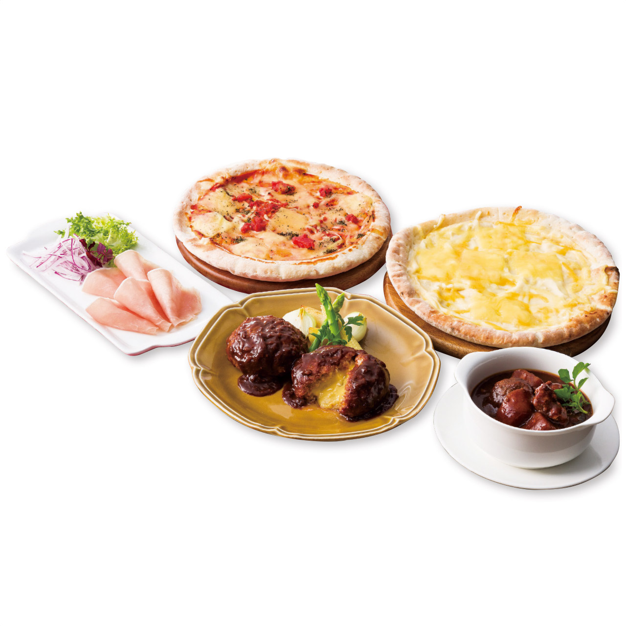 ■商品詳細 ピザ(マルゲリータスペシャリテ270g・4種のチーズスペシャリテ260g)・ビーフシチュー180g・生ハムスライス45g各1個・ハンバーグ(デミグラスソース・デミグラスソースチーズ入り各2個・各120g)・賞味期間/製造日より冷凍365日・【卵・乳成分・小麦・牛肉・大豆・鶏肉・豚肉・魚介類】
