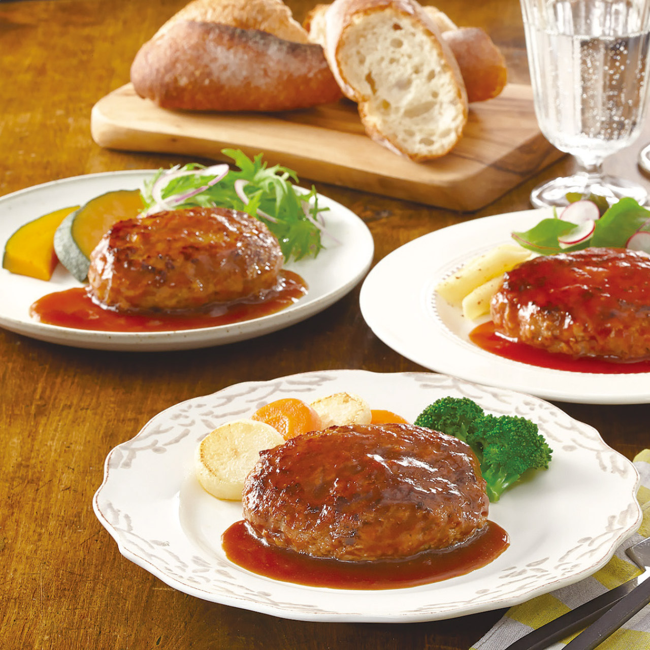 ふっくらした「厚み」でじっくりと焼きあげた、荒挽ハンバーグのセットです。3種類のソースでお楽しみください。