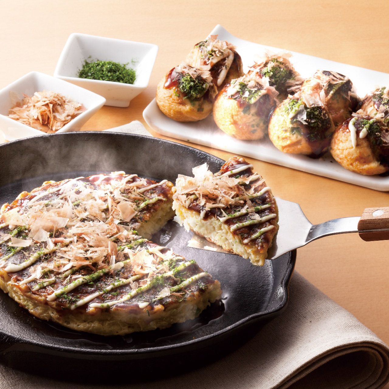 大阪千日前にて1973年創業のお好み焼の名店「千房」の味をご家庭で。千房オリジナルのお好み焼ミックス粉を使って、ふっくらと焼き上げたお好み焼豚玉ともちチーズに醤油味のねぎ焼と、生地をとろっと仕上げたたこ焼の4種類をセットにしました。電子レンジで温めるだけで名店の味をご家庭でお楽しみいただけます。