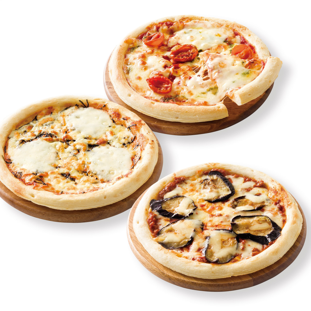 ■商品詳細 マルゲリータ(ドライトマトとフレッシュモッツァレラ)2枚・なすとひき肉の辛味トマトソース・博多辛子明太子とフレッシュモッツァレラ・クワトロフォルマッジ各1枚・賞味期間/製造日より冷凍約365日・【卵・乳成分・小麦・牛肉・大豆・鶏肉・豚肉・りんご】
