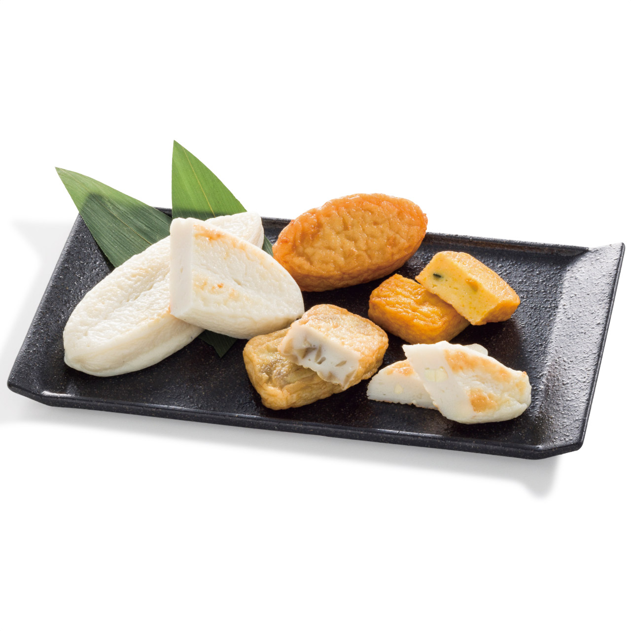 素材にこだわり、保存料・でんぷん・卵白を使用せず、厳選した魚のすり身と自然の素材(吉次魚醤などの天然調味料)だけで焼き上げた、鐘崎の看板商品「大漁旗」を中心に、かまぼこと相性の良いチーズを練り込んだ「味ささ」、滑らかな食感が特徴の揚げかまぼこ「旨揚げ」を詰合せました。