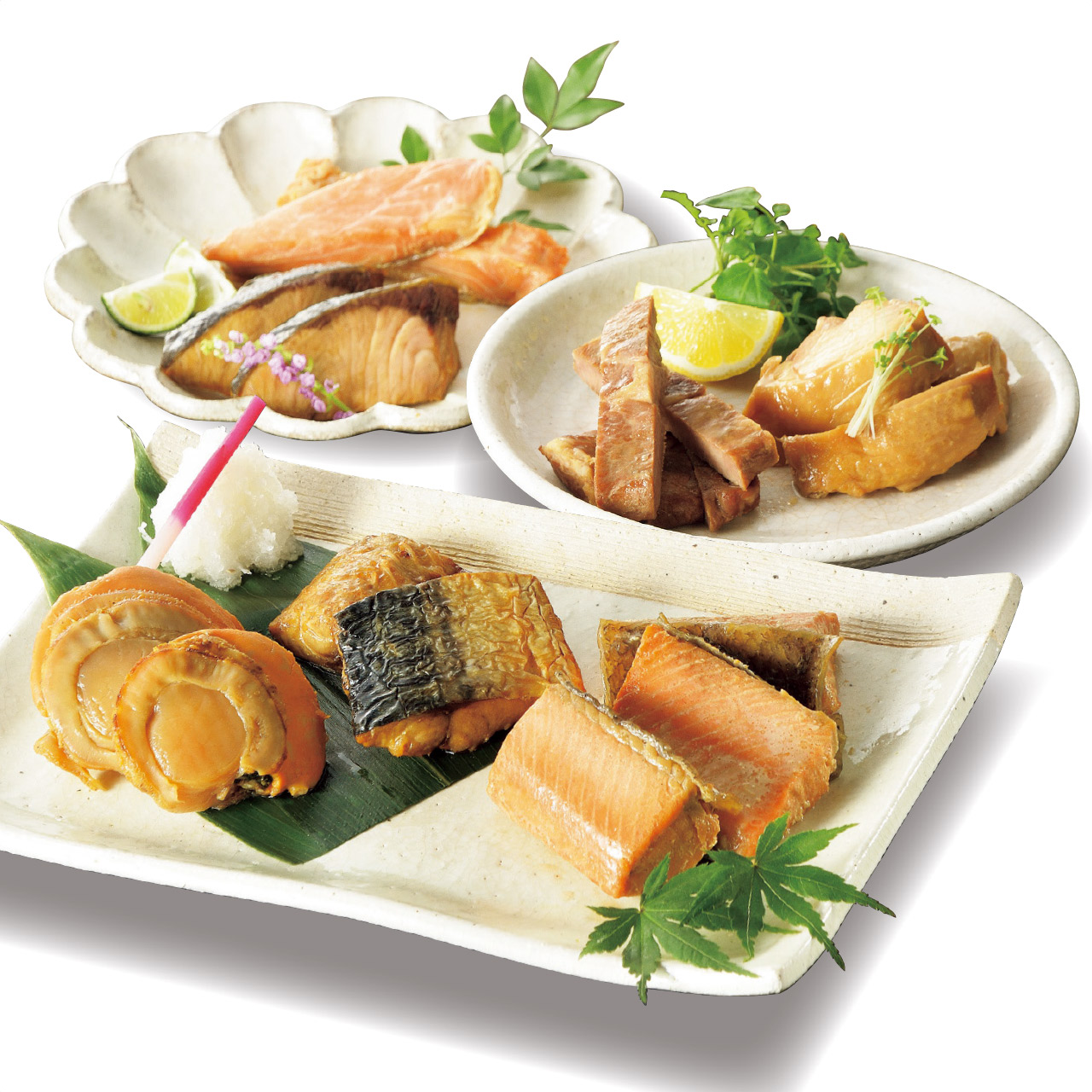 ■商品詳細 焼漬さけ(3切入)・さば(3切入)・豚肩ロース150g・鶏もも150g各1個・賞味期間/冷蔵約30日・賞味目安約23日・【小麦・さけ・さば・大豆・鶏肉・豚肉】