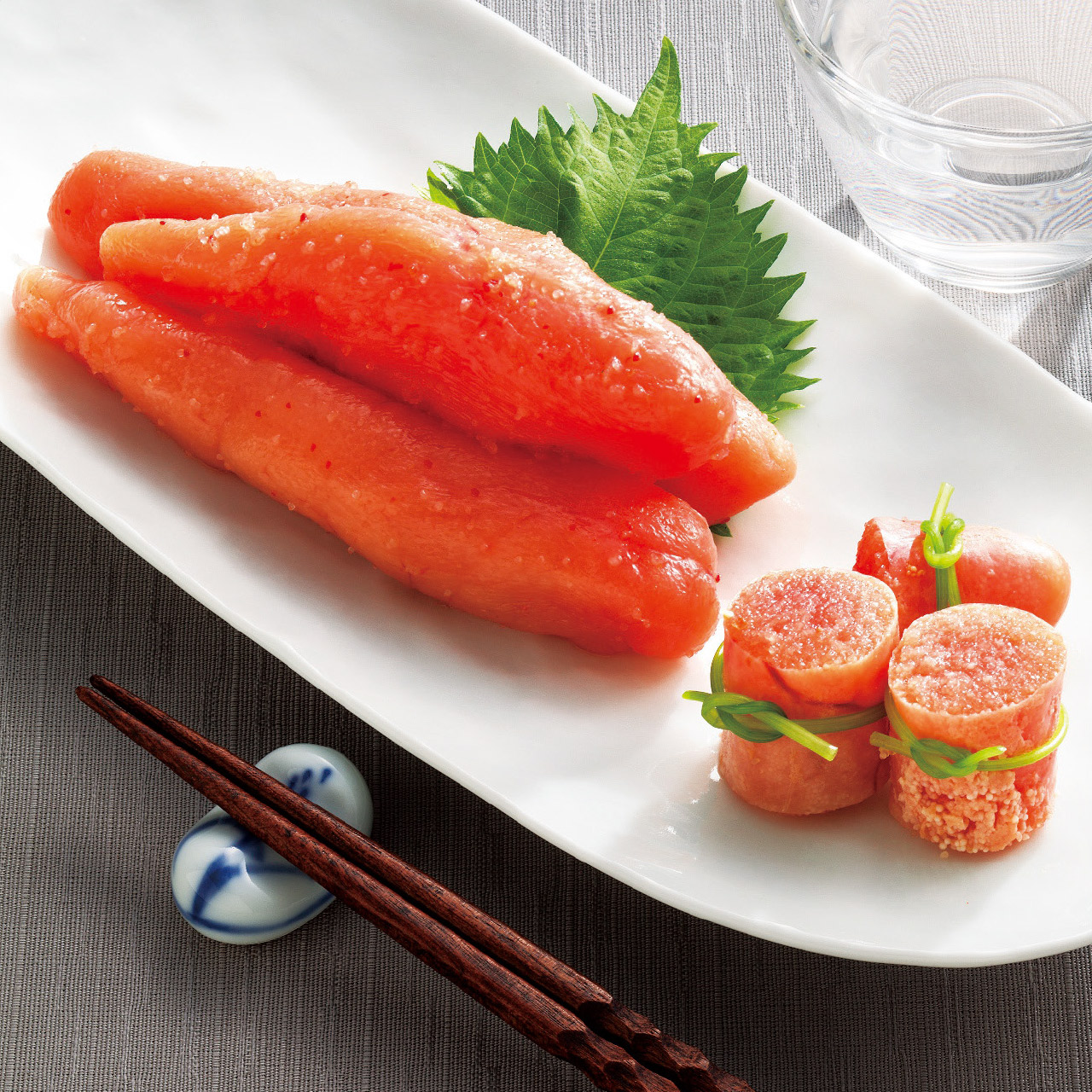 喜多屋のお酒をベースに、まろやかな旨味を引き出す羅臼昆布と隠し味に九州産柚子をを加え、創業以来、継ぎ足し受け継ぐ「匠のタレ」で168時間じっくり漬け込み熟成させた、コク深くまろやかな旨味の明太子です。