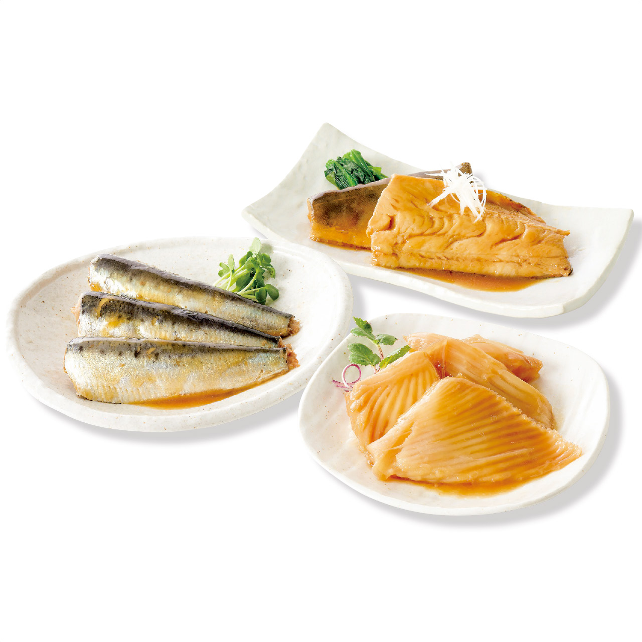 ■商品詳細 かすべ煮つけ・ほっけ煮つけ・いわし照り煮各1個・賞味期間/製造日より冷凍約360日・【小麦・大豆】