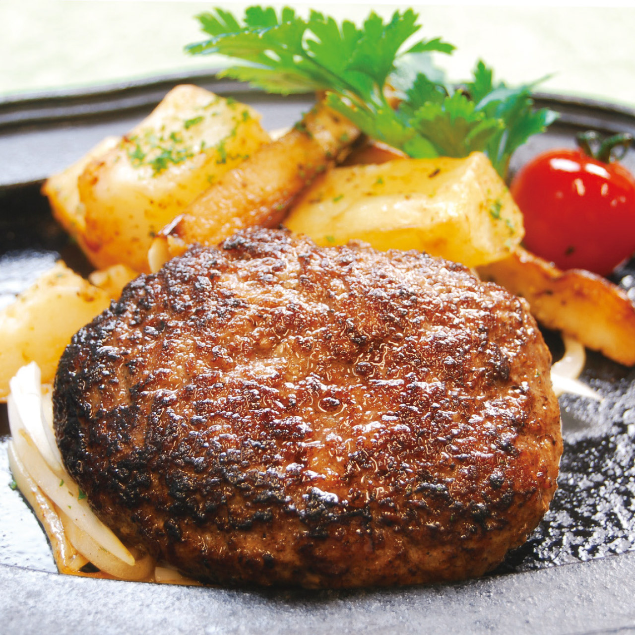 湖国の名産、近江牛と黒豚肉で造られた、芳醇な肉汁溢れる極上ハンバーグ。