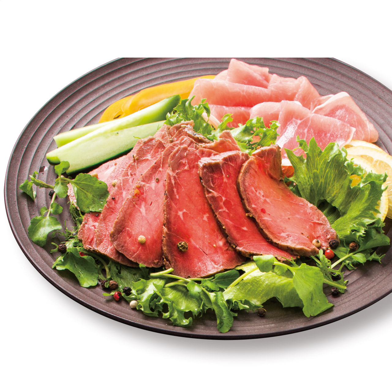 新規ローストビーフんのバラエティセット。新しくバラ焼豚、コールドポーク生ハムが詰め合わせになりました。新しいのローストビーフバラエティセットです。