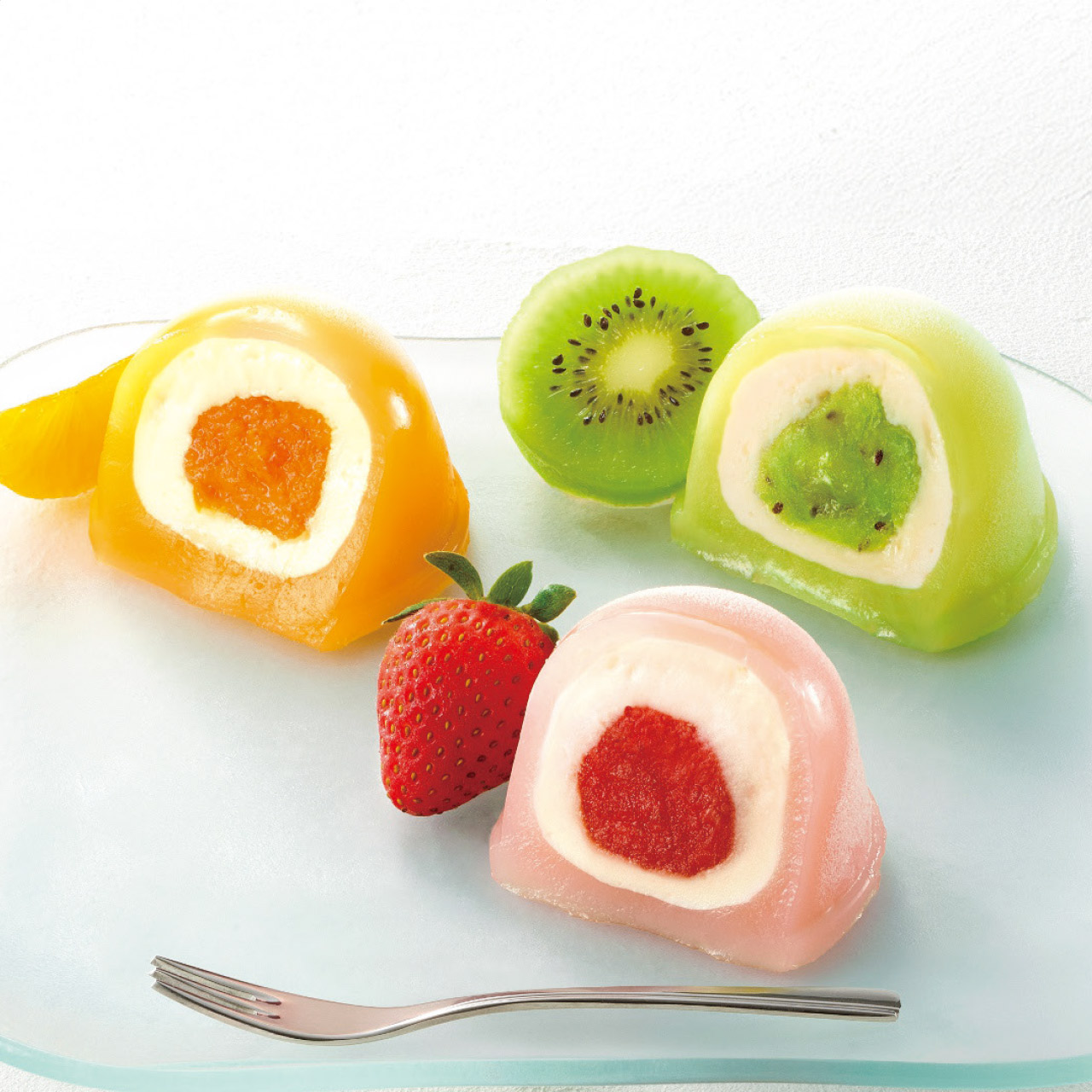 厳選したフルーツとコクのあるクリームを、もちもちのお餅で包み込んだ、甘酸っぱく、クリーミーな味わい。●いちご・・・いちご果肉入りソース、クリーム、もちもちのお餅が合わさる華やかな味わい。●みかん・・・みかん果肉入りソース、クリーム、もちもちのお餅が合わさる爽やかな味わい。●キウイ・・・キウイ果肉入りソース、クリーム、もちもちのお餅が合わさるフルーティーな味わい。
