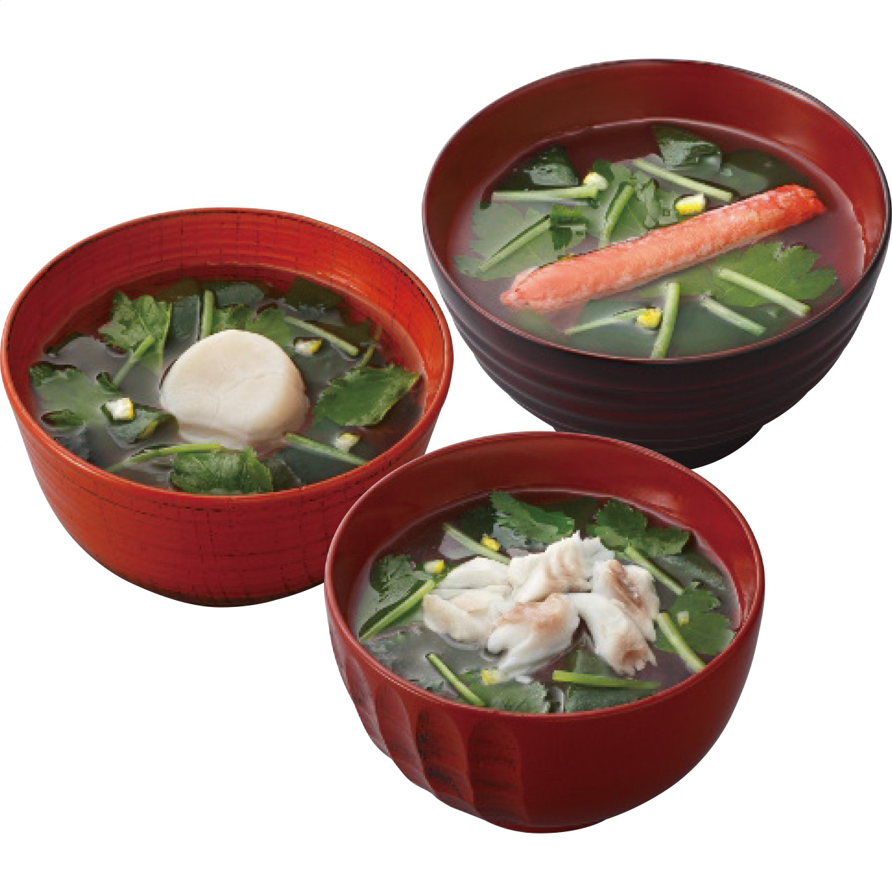 お湯を注ぐとふんわり姿を現すのは、大粒の帆立、大きな鯛の切り身、肉厚のずわいがに。最新のフリーズドライ技術が可能にした極上のお吸い物です。