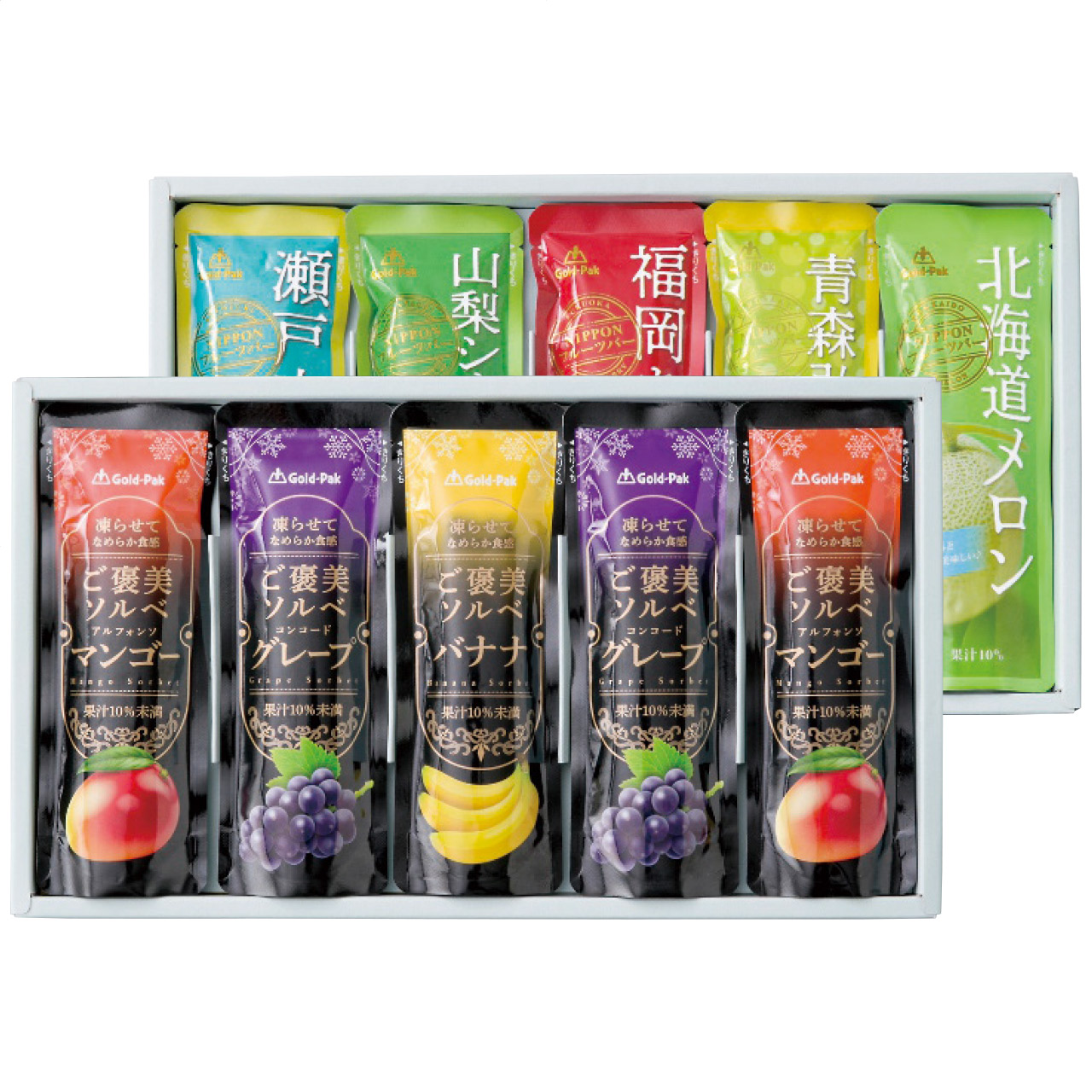 ■商品詳細 ご褒美ソルベ(マンゴー・グレープ各2袋・バナナ1袋)・シャーベット(北海道メロン・青森弘前王林・福岡あまおう・山梨シャインマスカット・瀬戸内レモン各1袋)・各80g・賞味期間/製造日より常温約300日・【小麦・オレンジ・かに・大豆・りんご・バナナ】