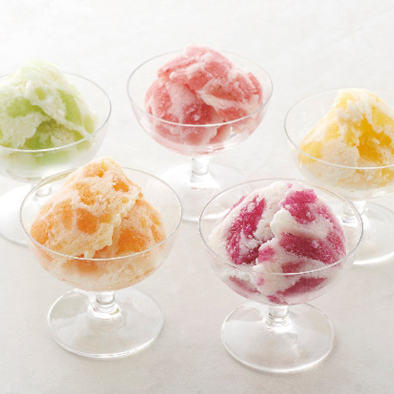 国産フルーツの美味しさを閉じ込めたシャーベットとなめらかなヨーグルトアイスのデザート。二つの味わいが織り成すフルーティーで爽やかな美味しさ。
