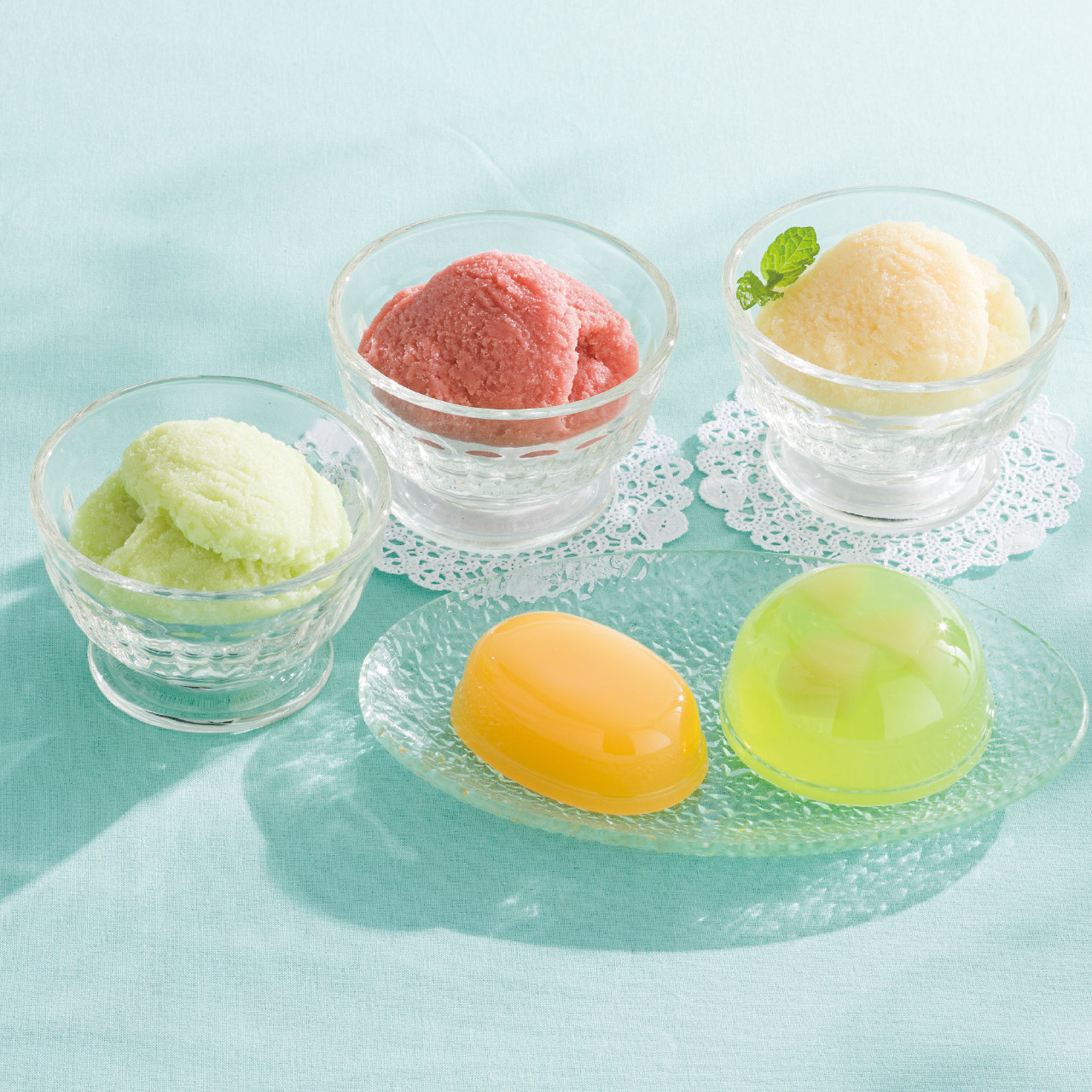 果肉入りゼリー、果汁入りゼリー、フルーツシャーベットすべて白桃を使った、白桃づくしのデザートセットです。