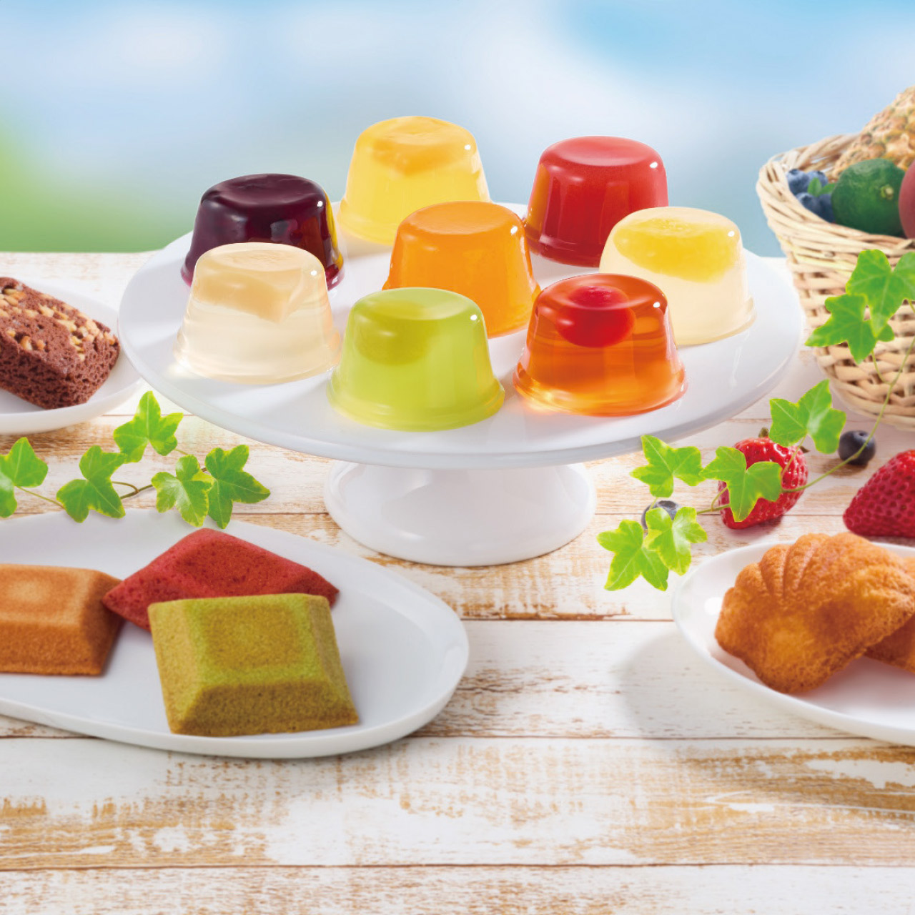 白桃、さくらんぼ、ぶどう、伊予柑の4種類、日本各地のフルーツを使用し、色とりどりのかわいらしくみずみずしさを閉じ込めたゼリーと、定番のマドレーヌやヌーヴェルガレットに夏向きのフィナンシェを詰合せた夏のギフトです。