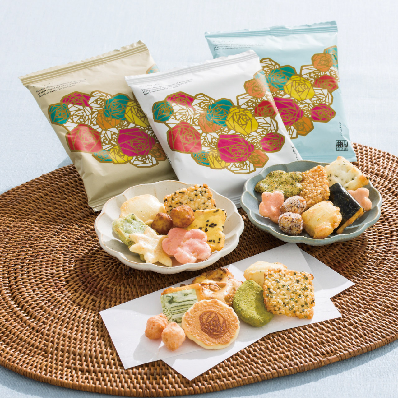 3種の食べきりのひとつつみにそれぞれ個性豊かなあられを詰合せました。パッケージデザインは、ステンドグラスをイメージした色彩豊かな花のモチーフは、日常を華やかに彩ります。爽やかな夏の味わいを加えた夏限定の詰合せです。