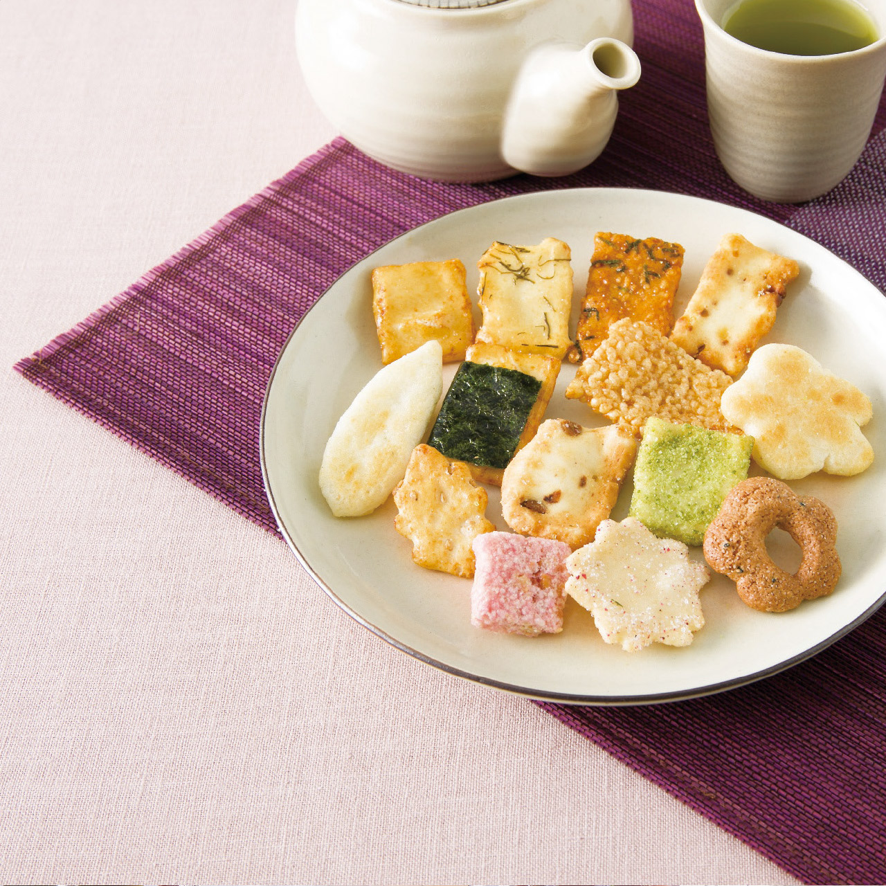 米と素材の味の調和を大事にした『あられ・煎餅』と、箸やすめとしての『干菓子』をお詰め合わせいたしました。