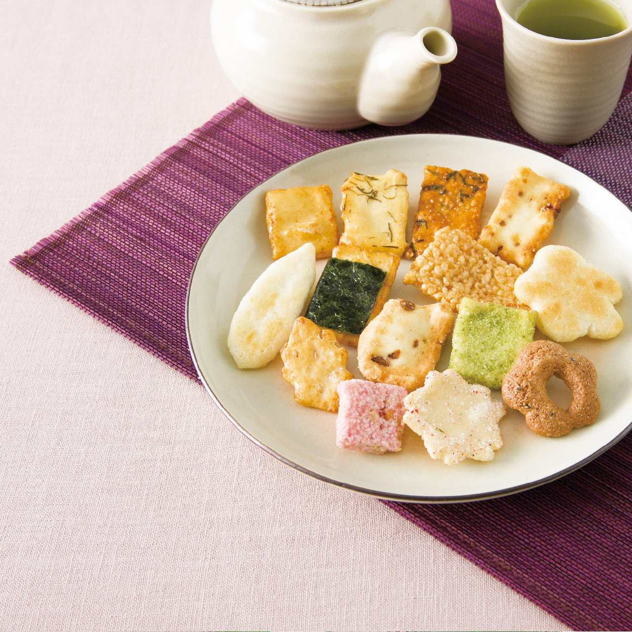 ■商品詳細 藤紫(焼海苔あられ・抹茶ざらあられ・白胡麻煎餅・大豆あられ・そばボーロ・海老煎餅・米粒あられ)・薄紅(梅ざら煎餅・落花生おこし・切昆布あられ・柚子あられ・アーモンドあられ・海苔ふり煎餅・あおさ煎餅)各9袋・賞味期間/製造日より常温約120日・【卵・小麦・そば・落花生・えび・ごま・大豆・鶏肉・アーモンド】