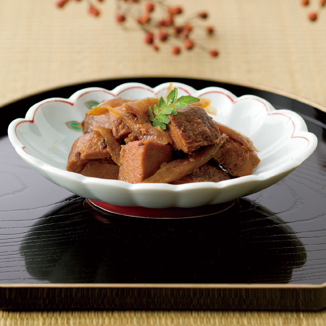 あめ色になるまでじっくりと炊き合わせ、お互いの旨みを充分に吸わせたきんぴらまぐろは、お子様からご年配の方まで幅広く人気の一品。そのまま酒の肴として、おにぎりの具にしても美味しくお召し上がりいただけます。木箱入りで目上の方への贈りものにもオススメです。