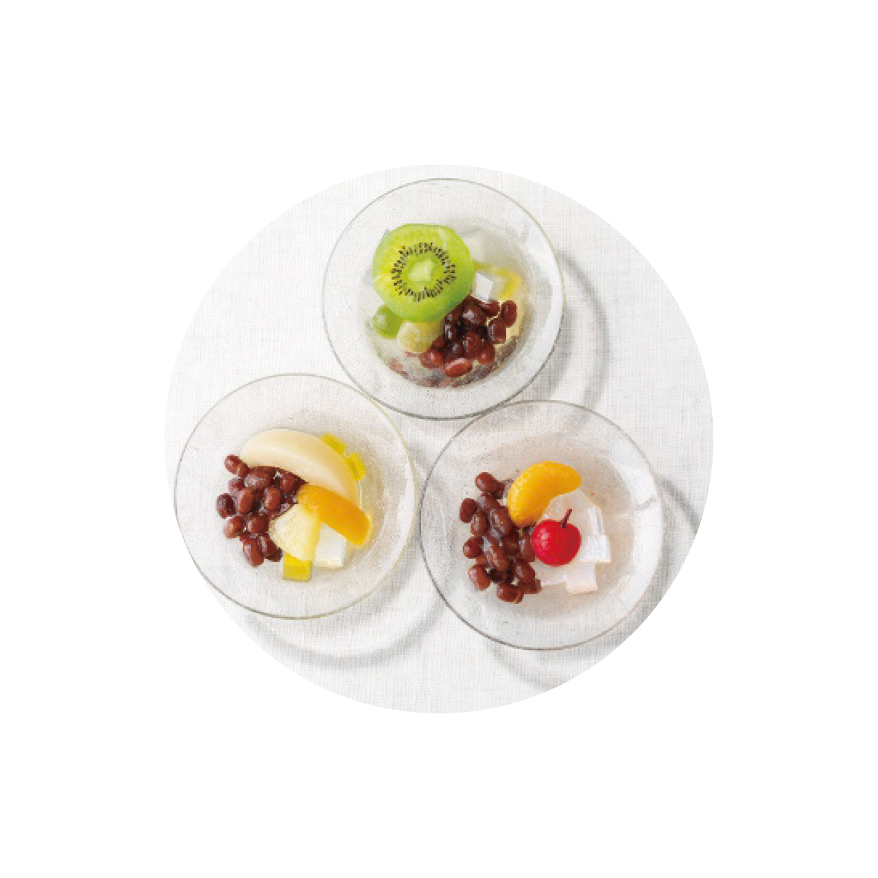 「みかん・チェリー」真っ赤な果実が印象的なチェリーに、みかんのつぶつぶとした食感。瑞々しい小豆と合わせ、 定番ながらも風味豊かな味わいです。「葡萄・キウイ」果汁たっぷりの葡萄と、あんみつには珍しいキウイの甘酸っぱさ。味にも見た目にも爽やかに仕上げました。「白桃・パイン」弾けるような果肉の白桃に、華やかな香りのパイン。黄色が夏の太陽を思わせる、ジューシーな一品です。