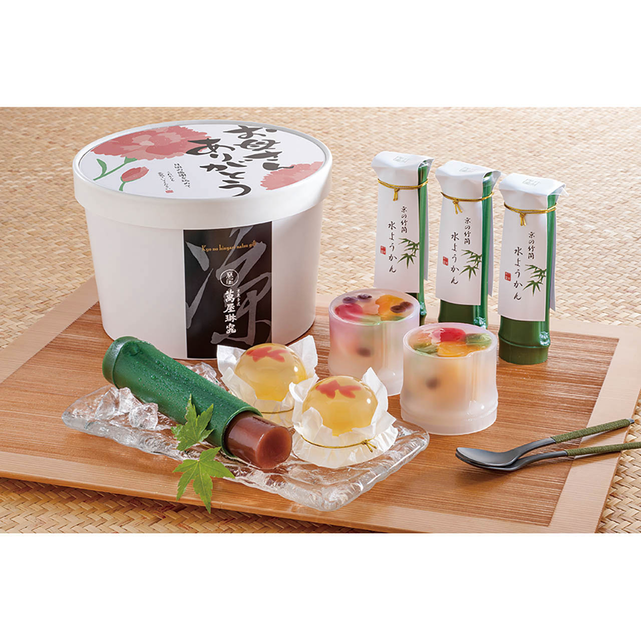 涼しげな金魚が泳ぐゼリー、カラフルなみつ豆ゼリー、口どけなめらかな竹筒入り水ようかんを詰合せました。母の日のメッセージをつけてお届けいたします。※竹筒はプラスチック製です。