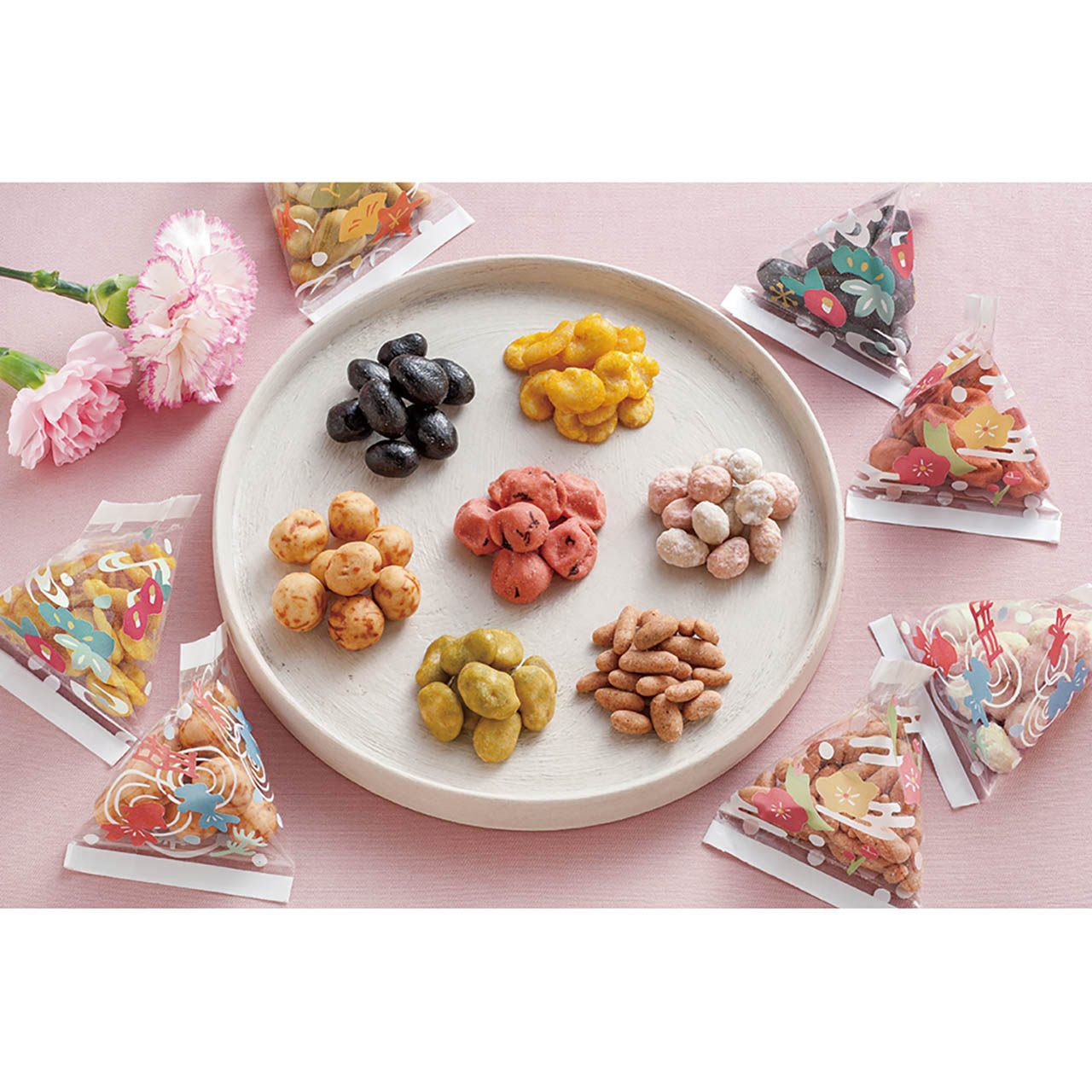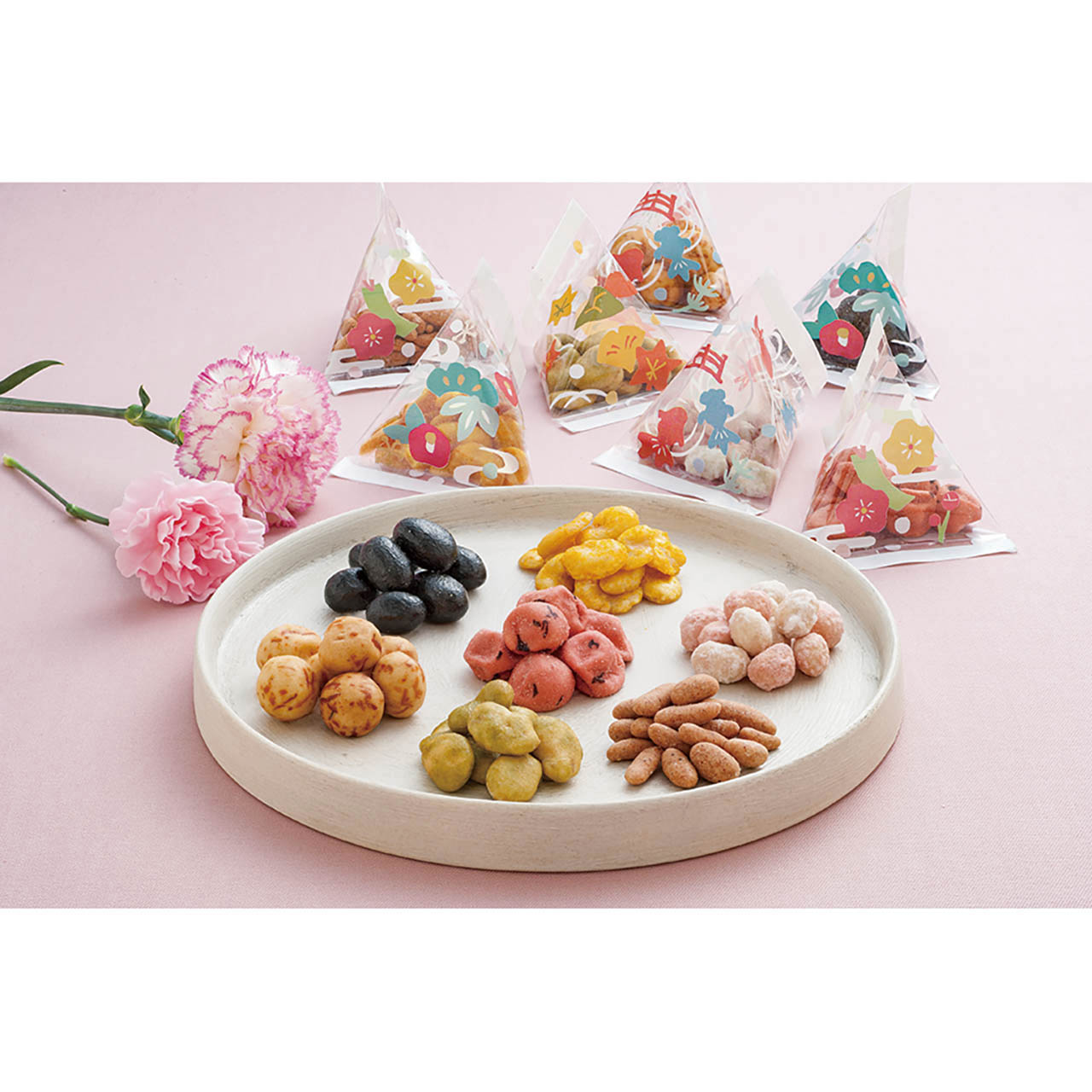 甘味系から塩味系まで、多彩なラインナップをお楽しみいただける、華やかで彩り豊かな豆菓子セットです。「豆(まめ)に過ごせますよう」の気持ちが伝わる心温まるギフトです。