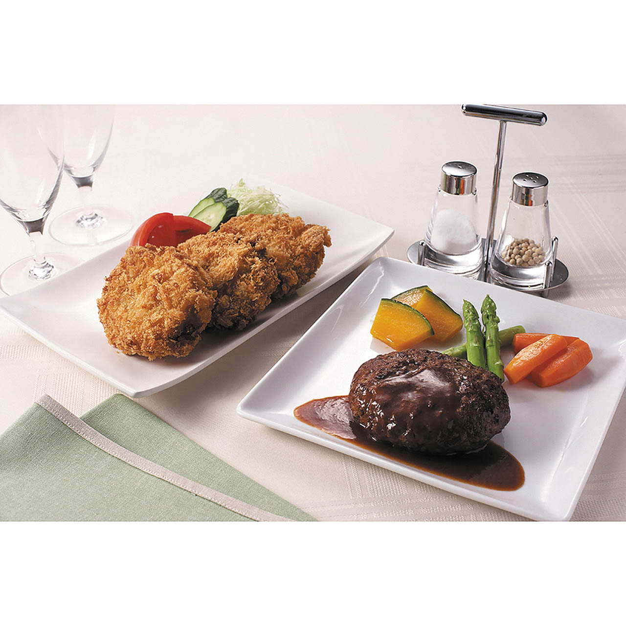 国産じゃがいも・たまねぎ、黒毛和牛を使用したサクサク衣のコロッケと、国産肉(牛肉・豚肉)・国産玉葱を使用し、肉の旨味を引き出すため調味料、香辛料などは控えめにし、あくまで素材の旨味を大切にしたハンバーグのセットです。自慢の特製デミグラスソースと共にお召し上がりください。