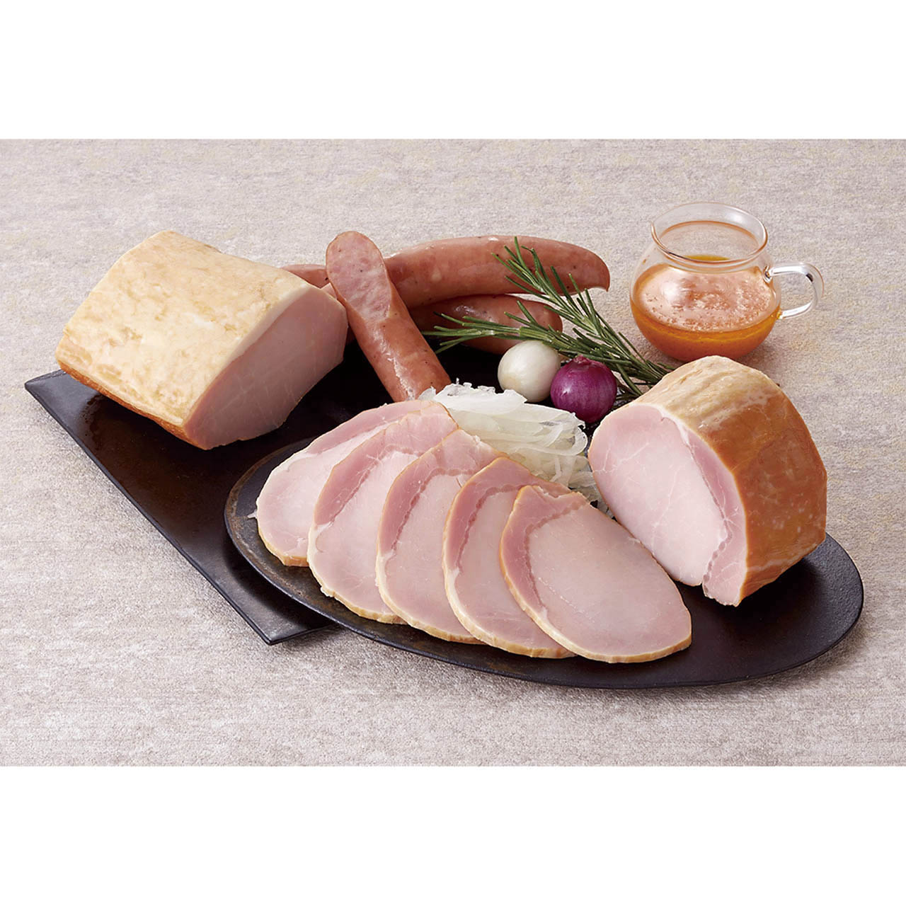 三田屋本店こだわりのロースハムとオリジナルドレッシング、さらに粗挽きフランクの詰合せ。三田屋本店自慢の、桜のチップで燻製をしたロースハムと 塩分控えめ、味をまろやかにコクを出す、野菜自体のうまみを引き出したドレッシングは こだわりのおいしいハムと一緒にたまねぎを添えて召し上がるのがおすすめです。三田屋本店のロースハムは、職人たちの確かな腕と目によって生まれた深みのある旨味、 たゆまぬ努力によって磨き上げられた本物だけが持つ、豊かな味わいです。