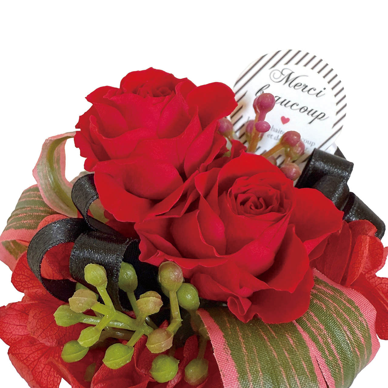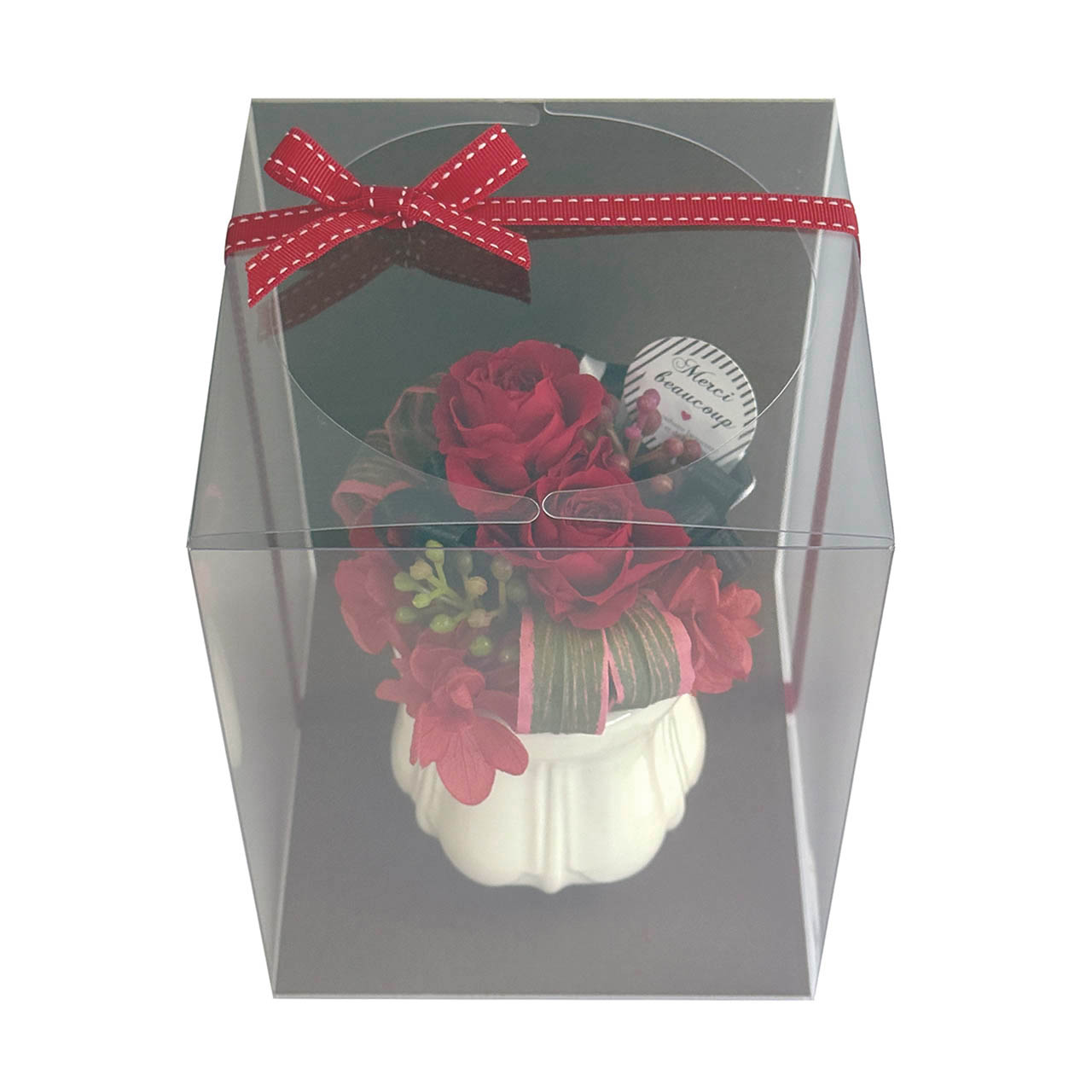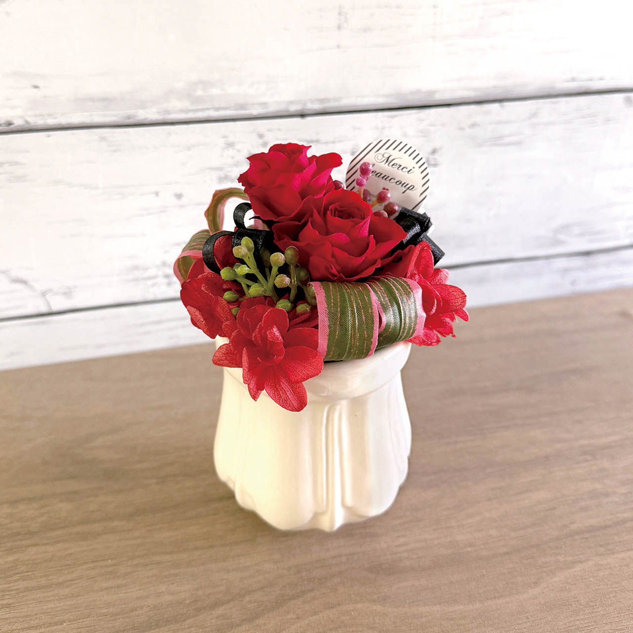 ふんわりとしたボリューム感が魅力のプリザーブドフラワーアレンジメント。ピックには"Meruci"(フランス語でありがとう)のメッセージ入りです。