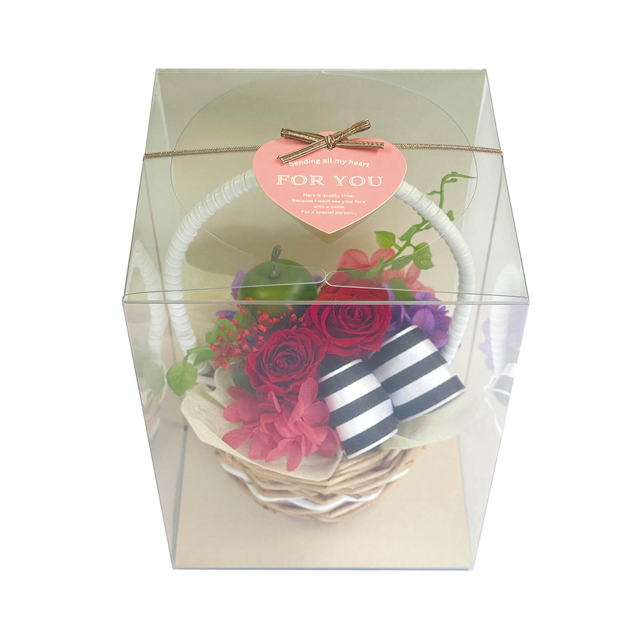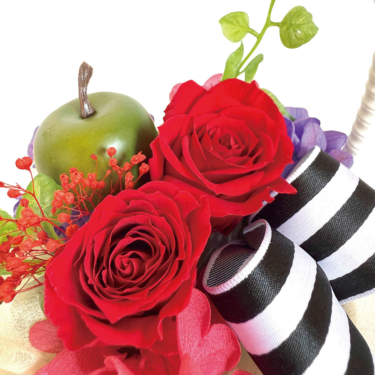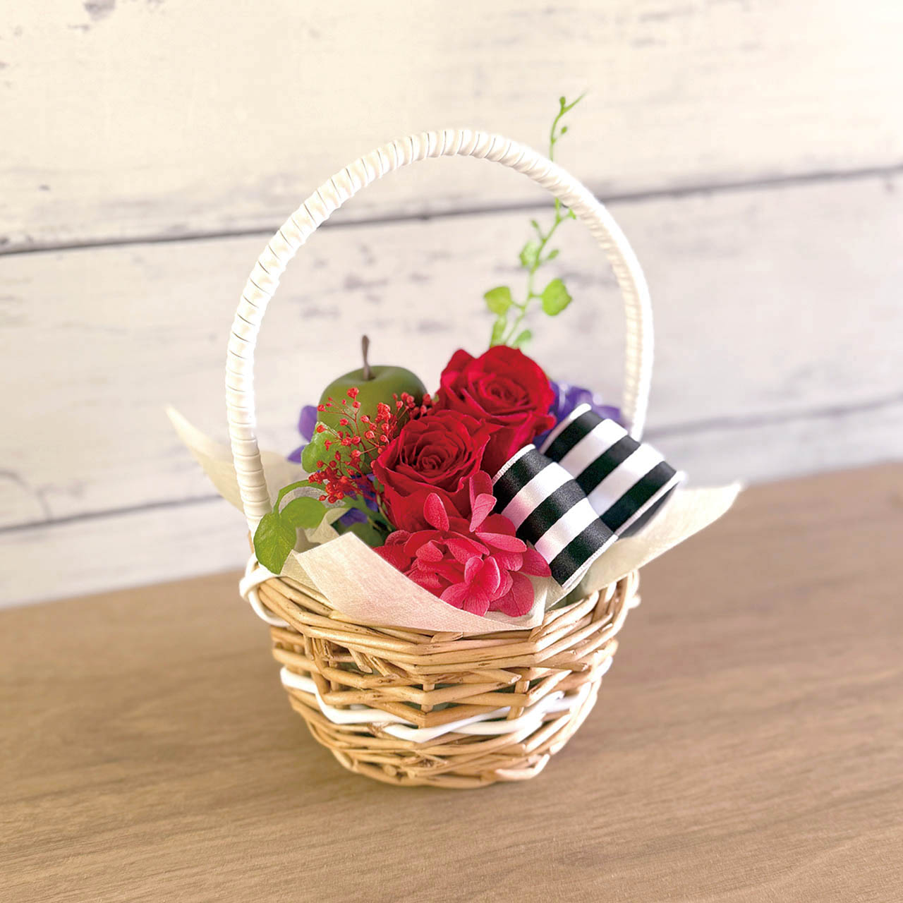 バスケットにはお花とプリサイズのアップル。軽やかで華やかなアレンジメントです。