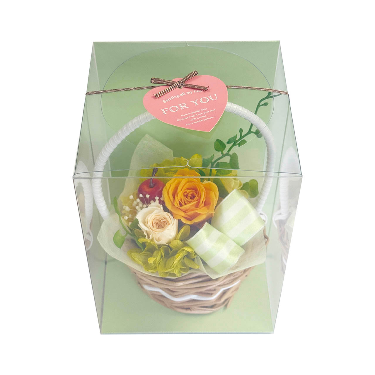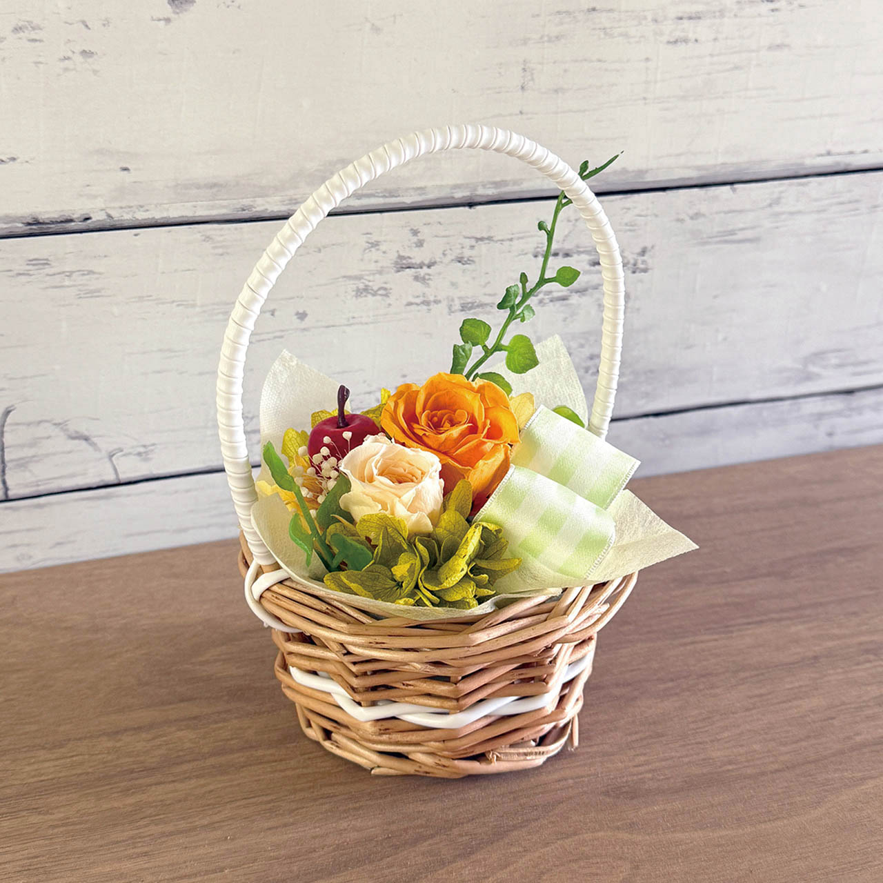 バスケットにはお花とプリサイズのアップル。軽やかで華やかなアレンジメントです。