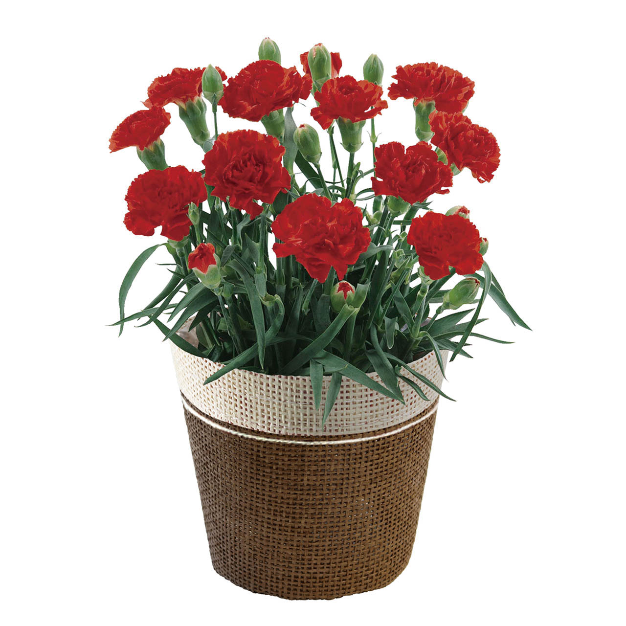 ■商品詳細 カーネーション(レッド)4号1鉢、サイズ:高さ:約20cm、バスケットもしくはラッピングバッグ、長崎かすてら(6切入、162g)
