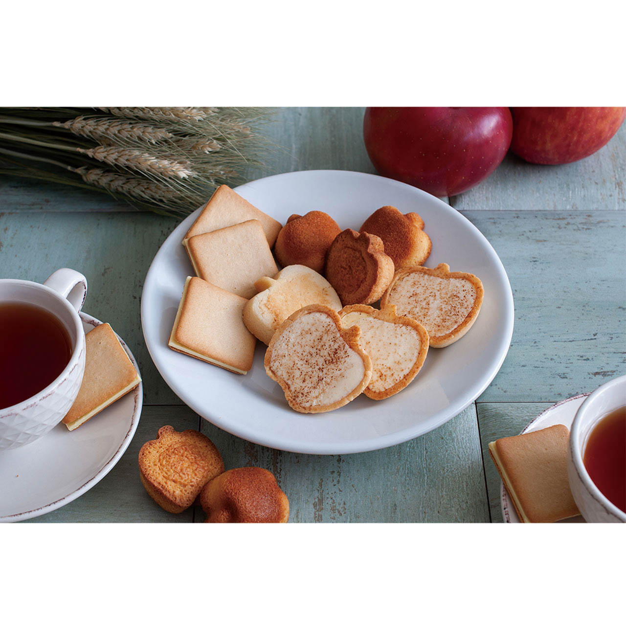 しっとりしたりんごのフィナンシェとサクサク食感のりんごのクッキー、りんご型のチョコレートタルト、3種類のりんごのお菓子がセットになったギフト。