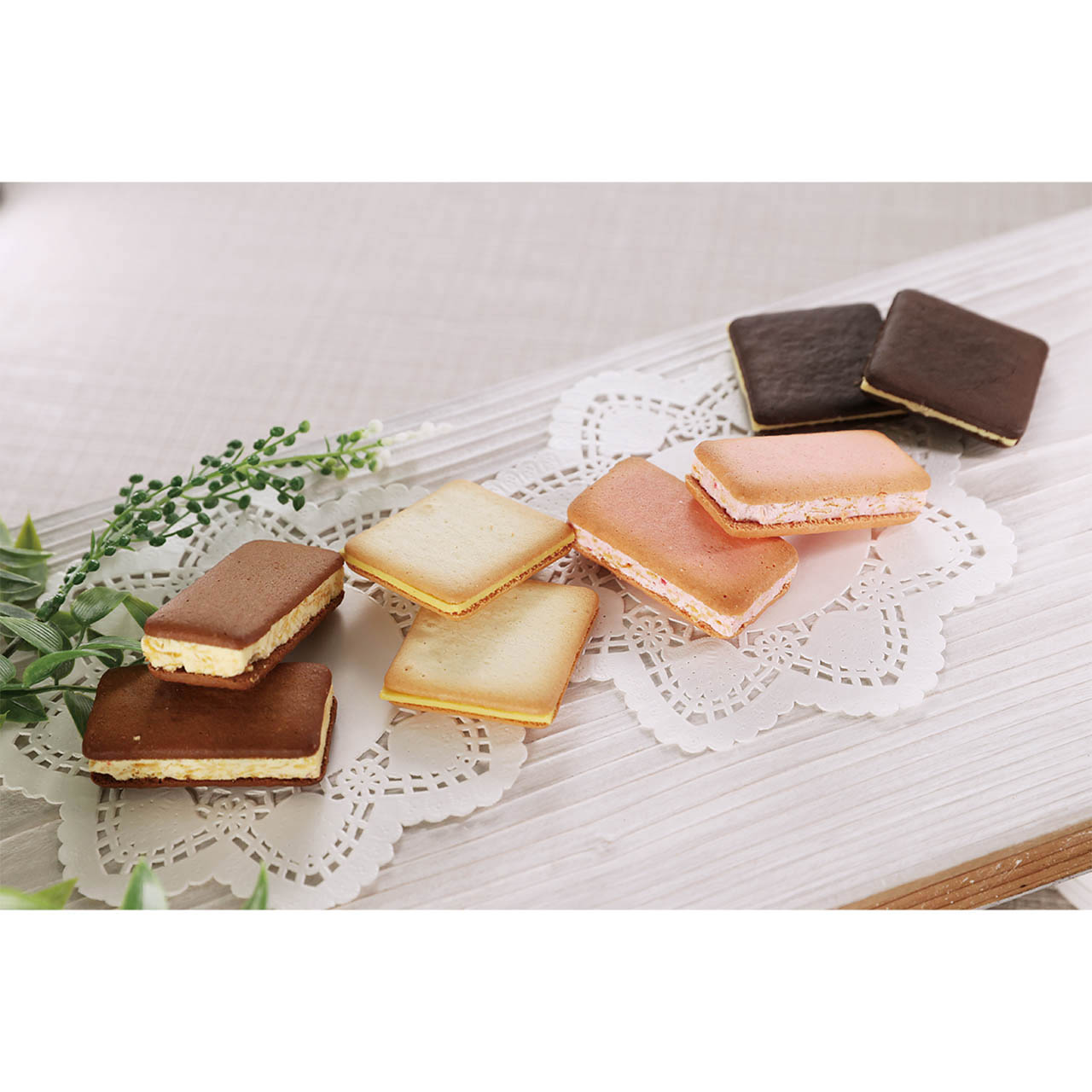 ■商品詳細 苺パフェサンドクッキー4個、プリンアラモードクッキー4個、スイートポテトラングドシャ6個、チョコバナナラングドシャ6個