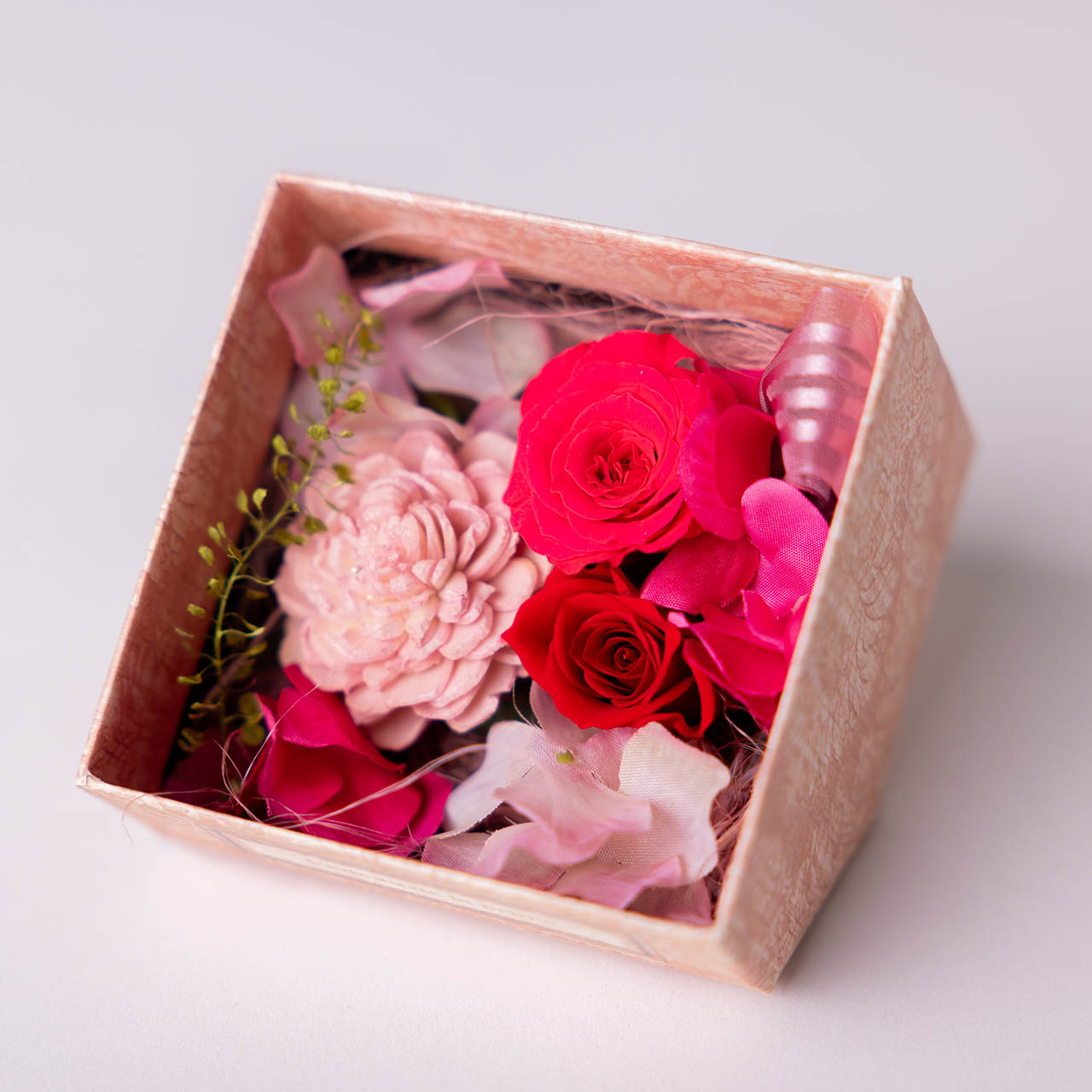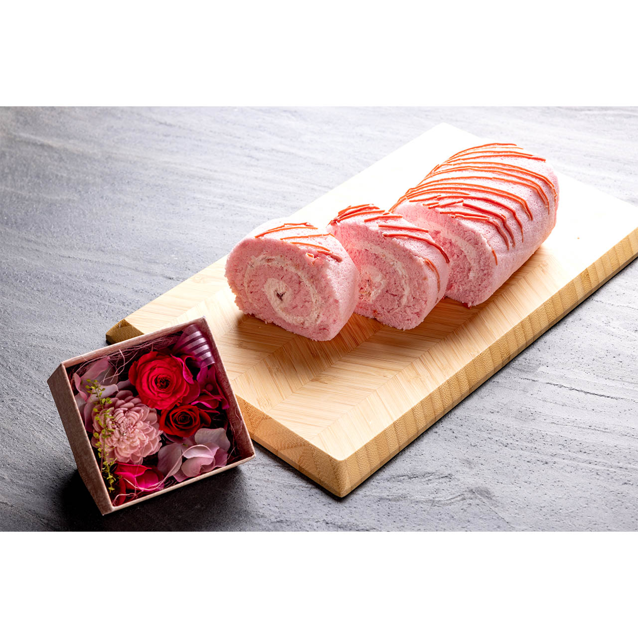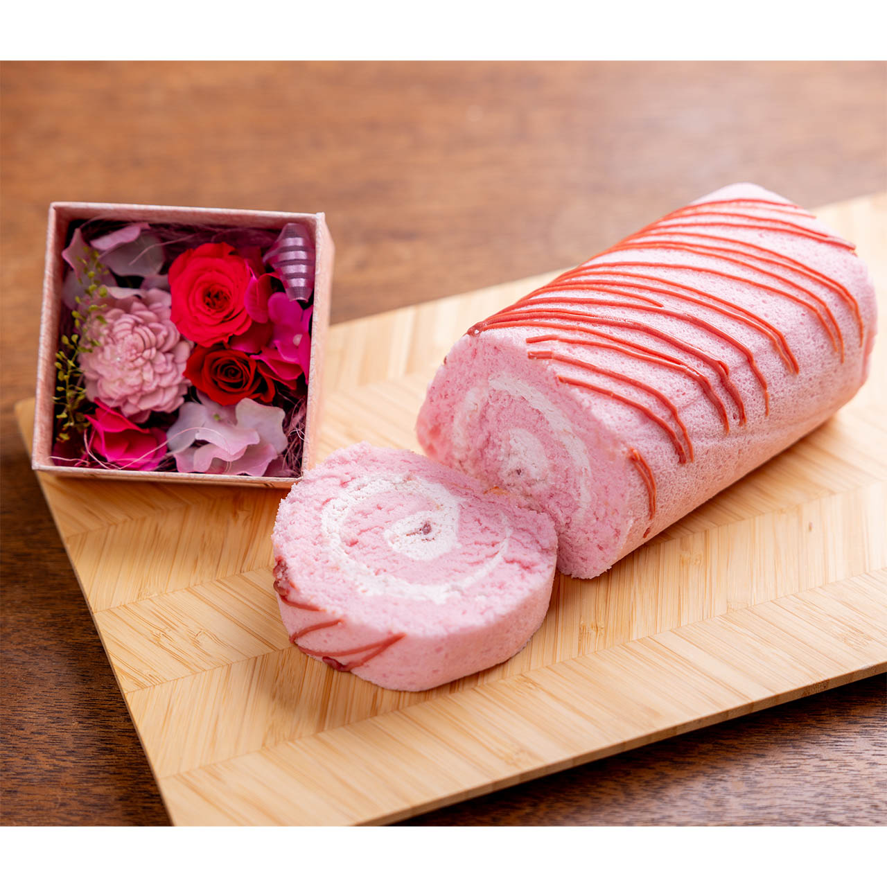 苺づくしのロールケーキと美しいプリザーブドフラワーをセットにしました。