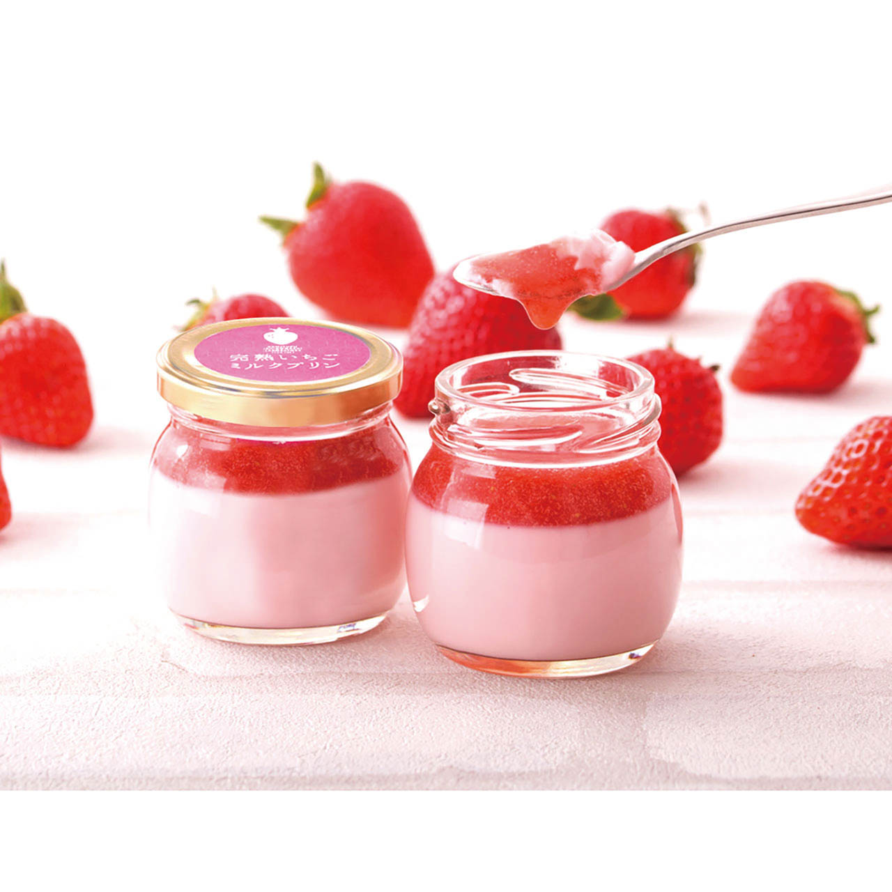 プリンとソース、ダブルのいちごで美味しさにこだわった「完熟いちごミルクプリン」と感謝の気持ちのグリーティングカードのセットです。