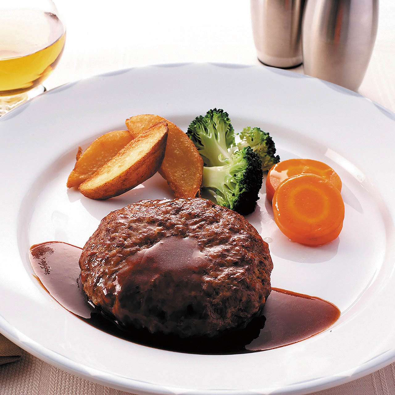 国産肉(牛肉・豚肉)と国産玉ねぎを使用した、こだわりハンバーグ。粗挽き肉を細挽き肉ですっぽりと包み込んだ2段仕込み製法でお肉の旨味を逃しません。
