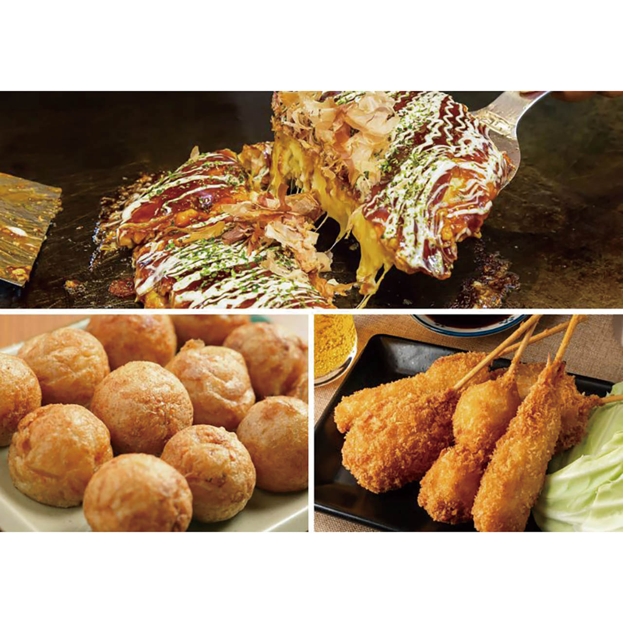 たこ焼き発祥の名店「会津屋」のダシ香るたこ焼き、ふわっと香ばしい「きじ」のお好み焼き、サクサク食感が楽しい本場仕込みの串カツを詰め合わせました。これひとつで、大阪の食い倒れ文化を自宅で楽しめる、贈り物にも最適なセットです。