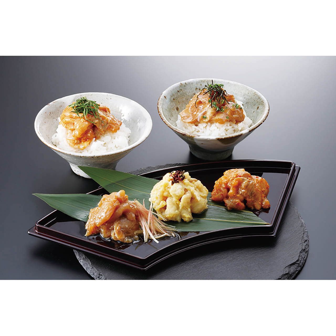 ユッケ風丼の具はピリッとした辛味にごまの風味。漬け丼の具は少し甘い醤油味に仕立てました。共にとらふく身皮のしっかりとした歯ごたえがやみつきになる食感です。ご飯にのせても、そのまま珍味としても美味しくお召し上がり頂けます。西京漬けはフグの食感と味噌の甘さが絶妙のバランスです。袋のままレンジで加熱してください。便利な個食サイズの詰合せです。
