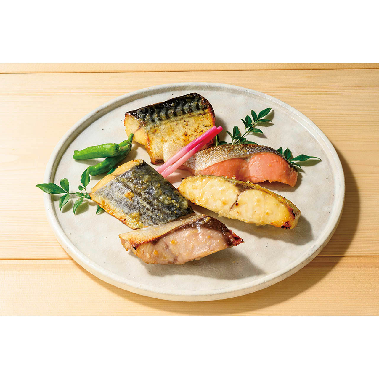 ■商品詳細 銀ひらす西京漬け60g×2、鯖西京漬け60g×2、銀鮭西京漬け60g×2、さわら西京漬け70g×2、ぶり西京漬け70g×2