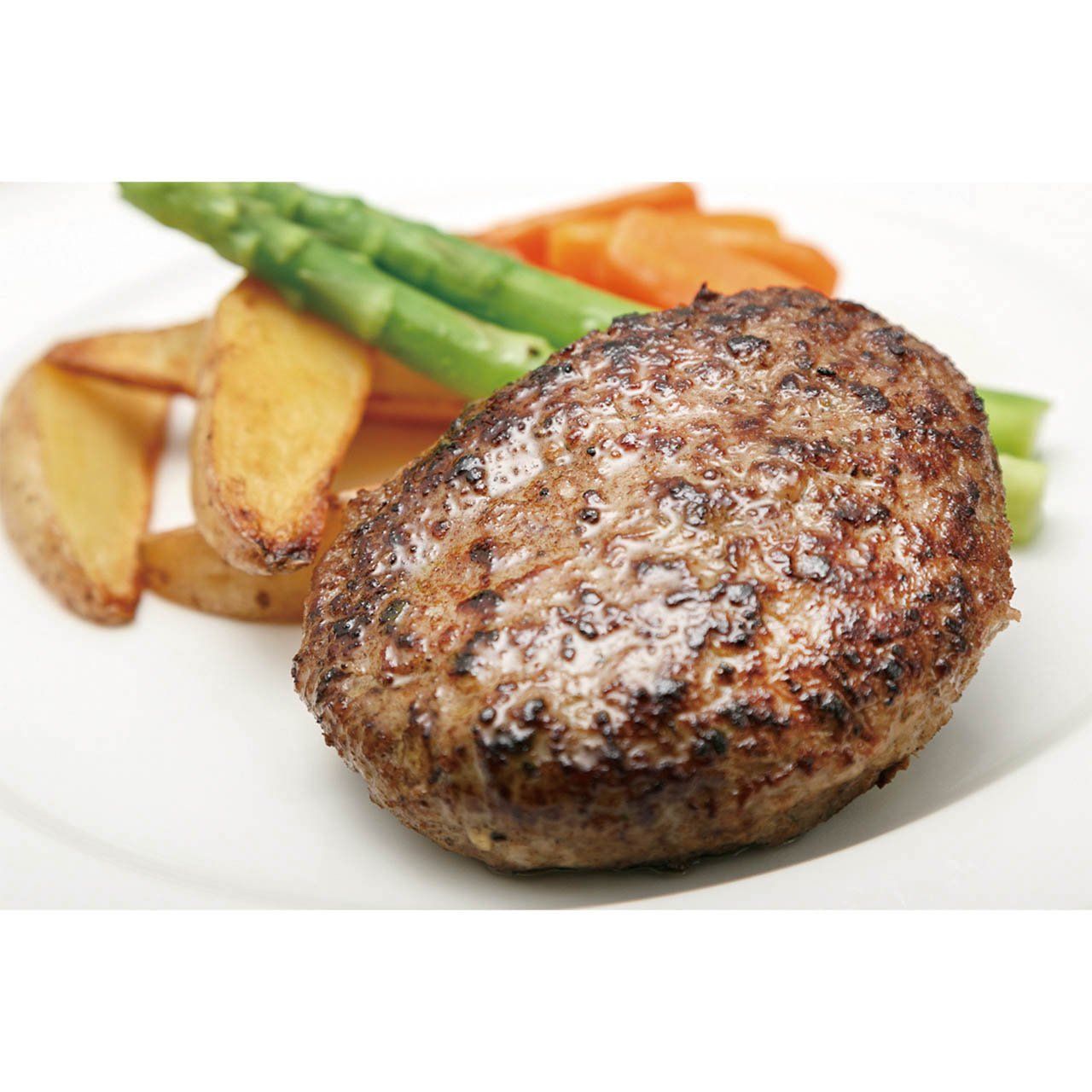 牛肉100%のハンバーグに細かく刻んだセロリやパセリを入れ、ブラックペッパーの風味を効かせました。香味野菜の甘みやほのかな香り、ブラックペッパーの刺激が食欲をそそります。香味野菜が苦手…という方でも食べられる、ソース不要のジューシーなハンバーグです。