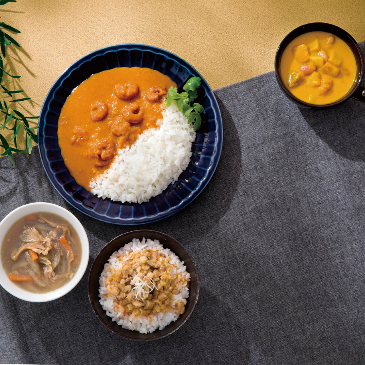 レモンのさわやかな風味と生クリームのまろやかさが特長のチキンカレー、上品で口当たりのよいコーンポタージュなどをセット。