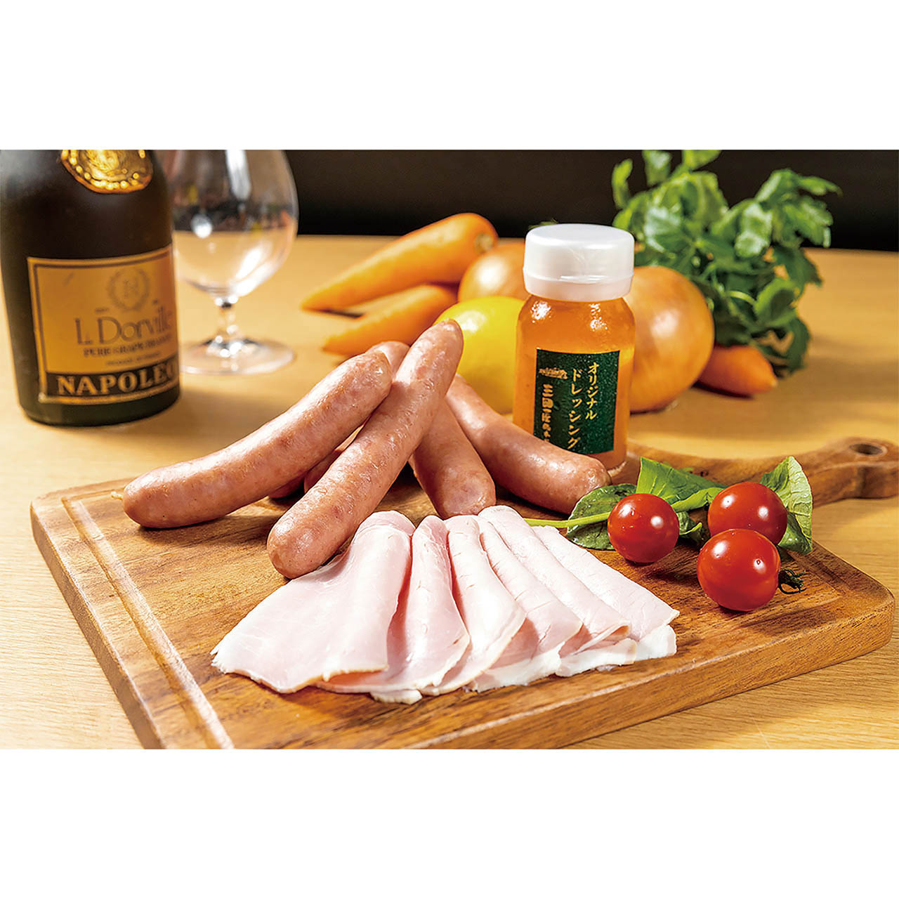 長期間熟成させた本格的な2種類のハムスライスとウィンナーのセット。ハムは生野菜たっぷりのドレッシングと共にお召し上がりください。