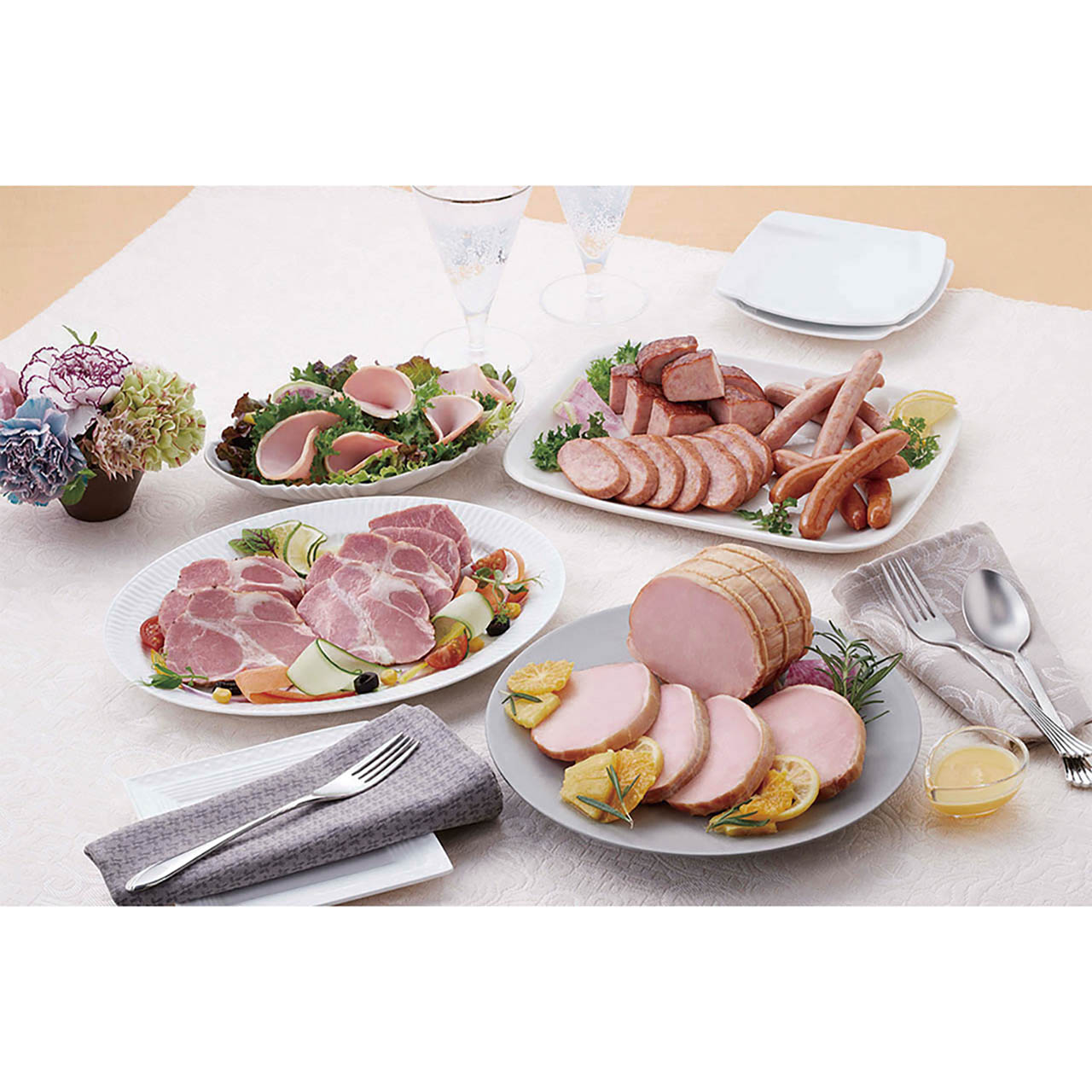 ■商品詳細 特選(燻しハム180g・あらびきヴルスト160g・あらびき燻しウインナー80g・あらびき芳醇ウインナー80g)、焼豚二段加熱仕立て160g