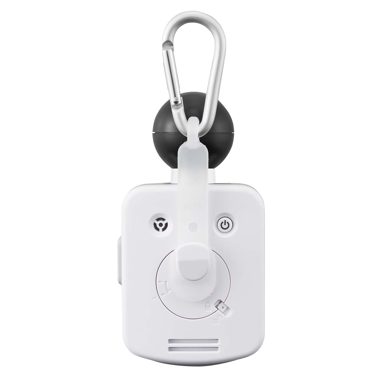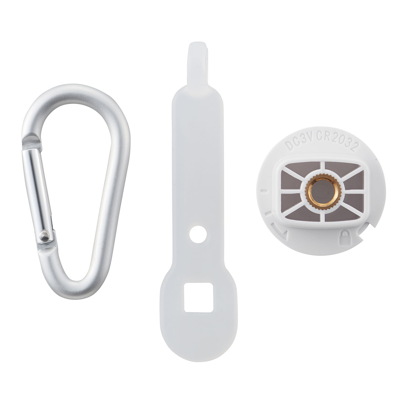 ■商品詳細 つり下げ用アタッチメント、カラビナ、 三脚取り付け用電池フタ、 お試し用電池(CR2032コイン形 リチウム電池)、保管用袋(本体梱包)、お知らせ(保証書付)、本体サイズ/幅 60mm × 高さ 112mm × 奥行 33mm・