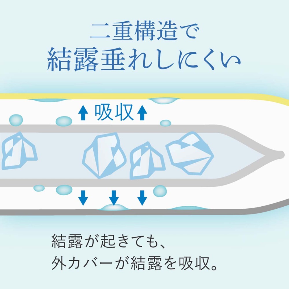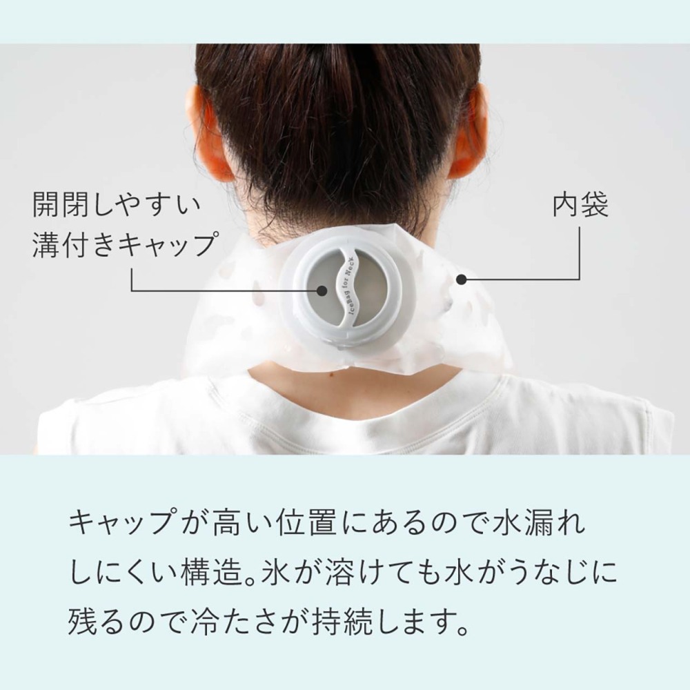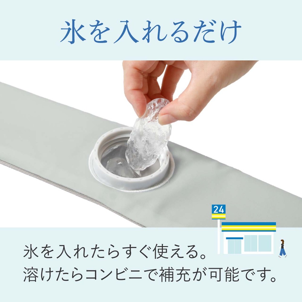迫り来る酷暑に「巻けるフィット氷のう」氷を入れて首に巻くだけ!1時間後も、しっかり冷たい。PU素材の内袋と、カバーの二重構造。汗のベタつきを防止するだけでなく、結露垂れしにくく快適にお使いいただけます。首にしっかりフィット、氷の冷たさが首筋に当たって気持ちいい。・閉めやすい溝付きキャップ。氷が溶けても水がうなじ部分に残るので冷たさが持続します。・氷が溶けたらコンビニで補充。※店舗・メーカーによって氷の大きさは異なります。本商品の氷投入口サイズ内の氷をご使用ください。カバーだけでも濡らして振ればひんやり。