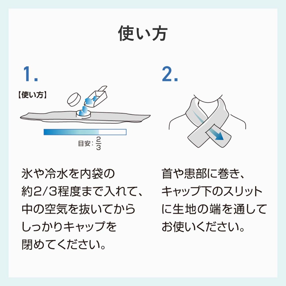 【使い方】1、氷や冷水を内袋に約2/3程度まで入れて、中の空気を抜いてからしっかりキャップを閉めてください。2、首や患部に巻き、キャップ下のスリットに生地の端を通してお使いください。